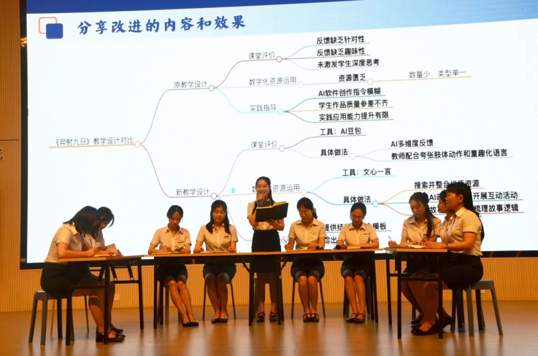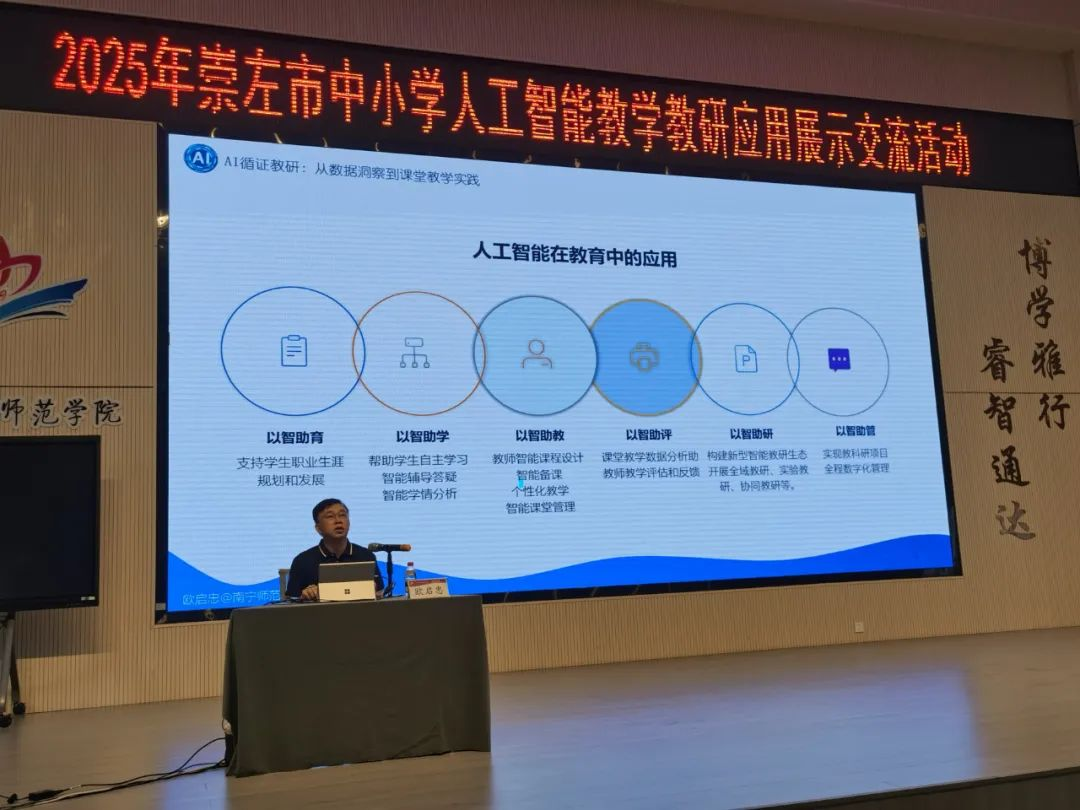 南宁师范大学人工智能学院副院长欧启忠教授以“人工智能循证教研”为主题,带来了一场精彩纷呈的专题讲座。欧启忠结合丰富案例,深入剖析人工智能在基础教育循证教研的深度应用,从理论框架到实践操作,为与会者提供了全面且实用的指导,充分展示了我校专家团队在推动人工智能赋能基础教育教研方面的专业引领能力。同时,广西民族师范学院附属第三小完美(中国)长陈留也进行了专题分享,附三小语文组教师则现场展示了人工智能在语文教研中的应用成果,生动呈现了新技术为教学带来的创新与变革。