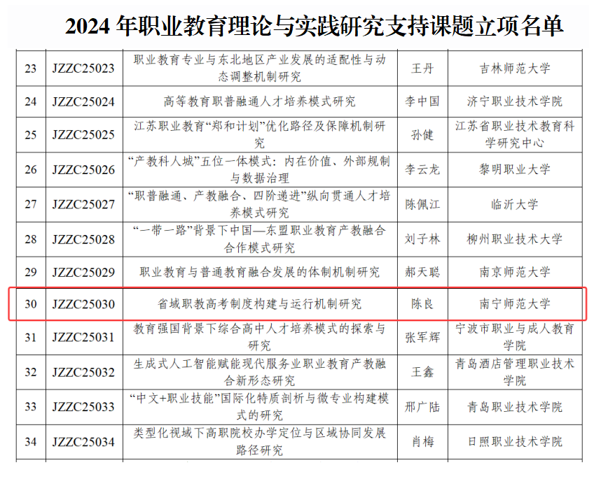 近日,教育部职业教育发展中心公布2024年职业教育理论与实践研究支持课题立项名单,我校职业技术师范学院院长陈良教授主持申报的《省域职教高考制度构建与运行机制研究》课题成功获批立项。该课题聚焦在现代职业教育体系构建中的热点问题,省域职教高考制度如何突破传统框架,构建起具有前瞻性、创新性的制度框架,以及形成与之适配的良性运行机制,旨在为新时代职业教育改革提供理论支撑与实践路径,标志着我校在职业教育研究领域取得新突破。