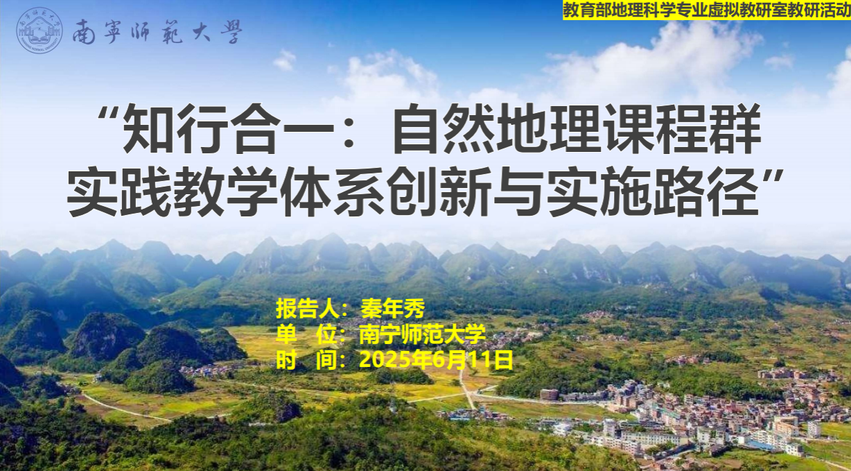我校秦年秀教授以“知行合一:自然地理课程群实践教学体系创新与实施路径” 为主题,从自然地理实践教学的痛点和国家战略与教育政策导向的角度提出了构建多维度、分层次的实践教学创新体系,解读了自然地理实践教学“知行合一”的内涵与框架,介绍了广西自然地理实践教学的6条典型线路,展示了如何通过防城港核电站选址分析、白头叶猴保护区生态调查等案例,实现理论与实践的深度结合。
