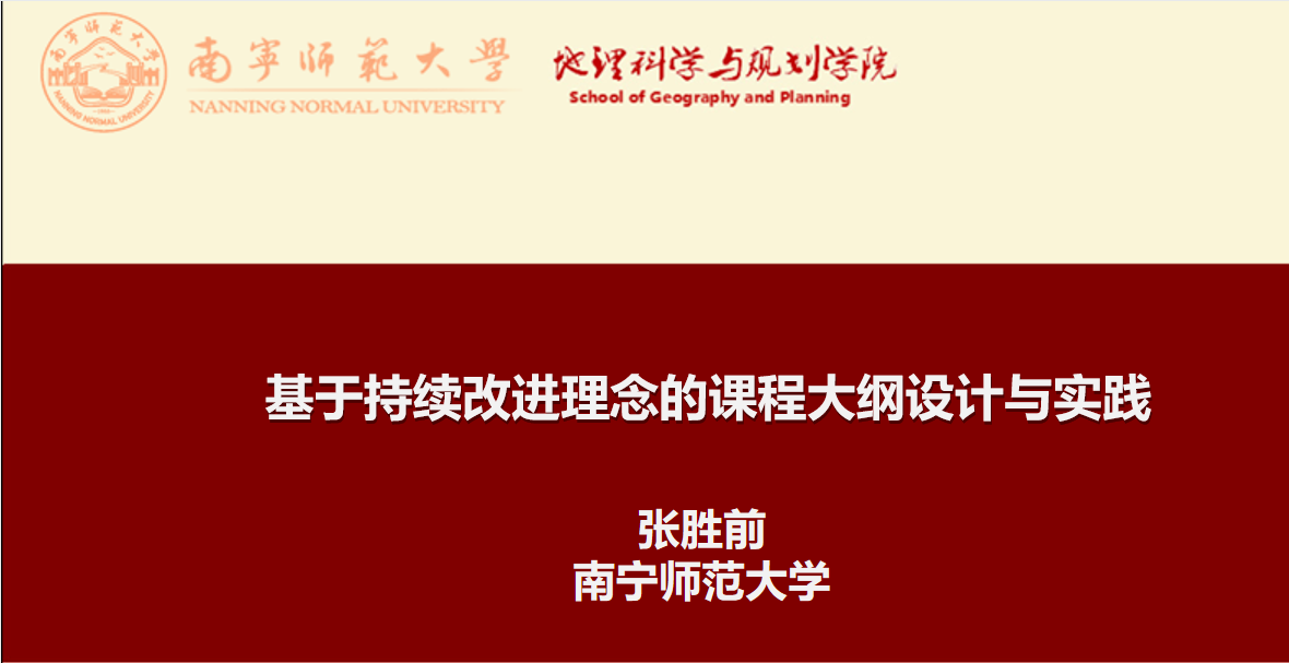 我校张胜前教授以“基于持续改进理念的课程大纲设计与实践” 为主题,从师范专业认证的角度解读了持续改进的认证核心理念,分析了课程大纲导向功能、评价功能、激励功能、反馈功能等的4个功能以及课程教学大纲制定的课程目标、课程内容、课程实施、课程评价等4个核心要素。他认为课程大纲不仅仅是课程计划的工具,而是教师和学习者间重要的连接点,更是教师和学习者间的一份契约,因此,要高度重视课程教学大纲在自然地理课程群建设中的作用。