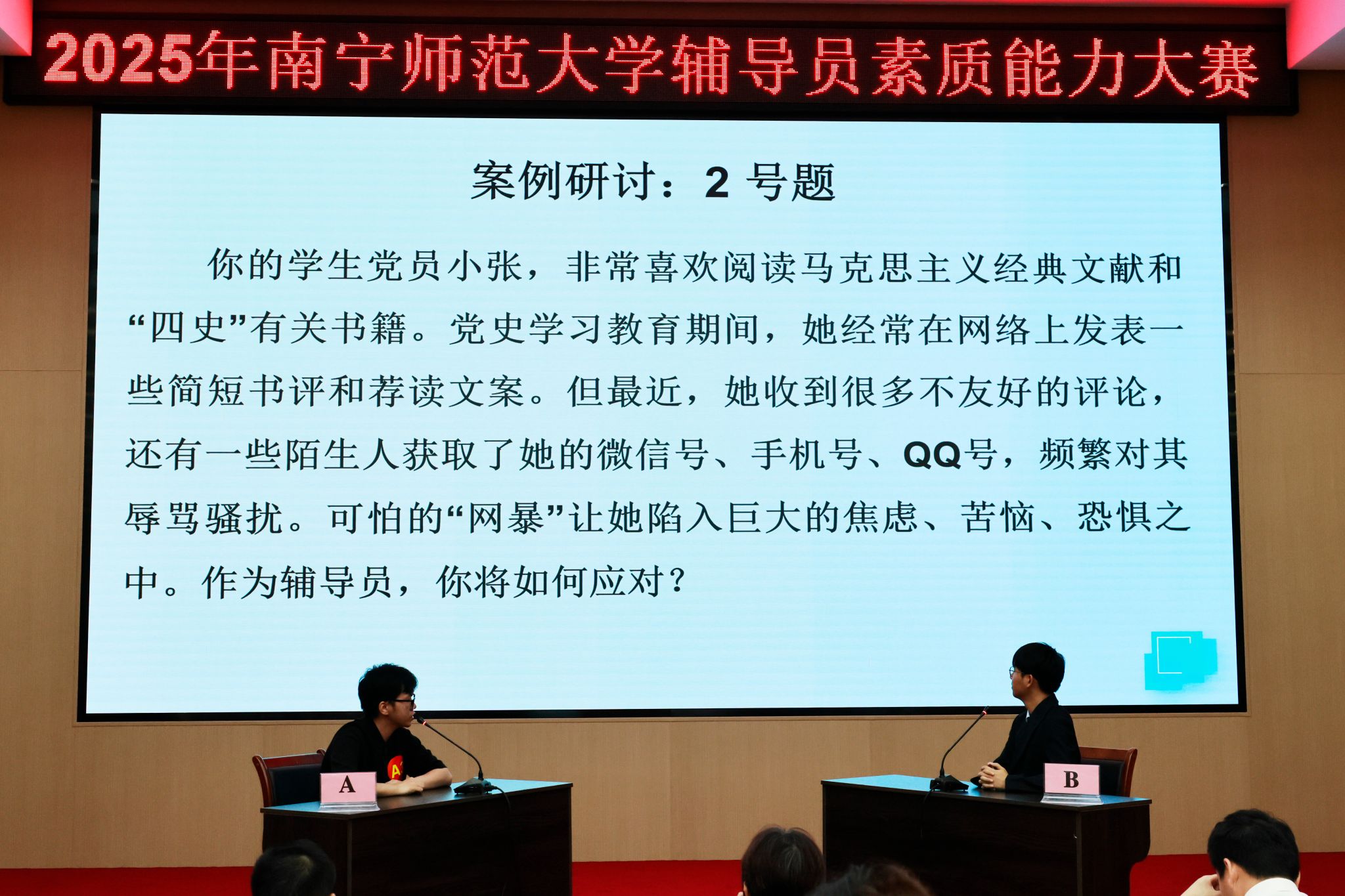 比赛对标广西区赛标准,设置了基础知识测试、案例研讨和谈心谈话三个环节,考察辅导员的理论素养、实践应变能力及育人实效。经过初赛笔试,遴选出22名选手进入案例研讨环节。该环节聚焦思想理论教育和价值引领、心理健康教育、就业创业指导等典型育人情境。选手们通过“案例剖析—对策研讨—评委提问”的流程,展现辅导员处理学生问题时把握核心矛盾并提出有效对策的能力。