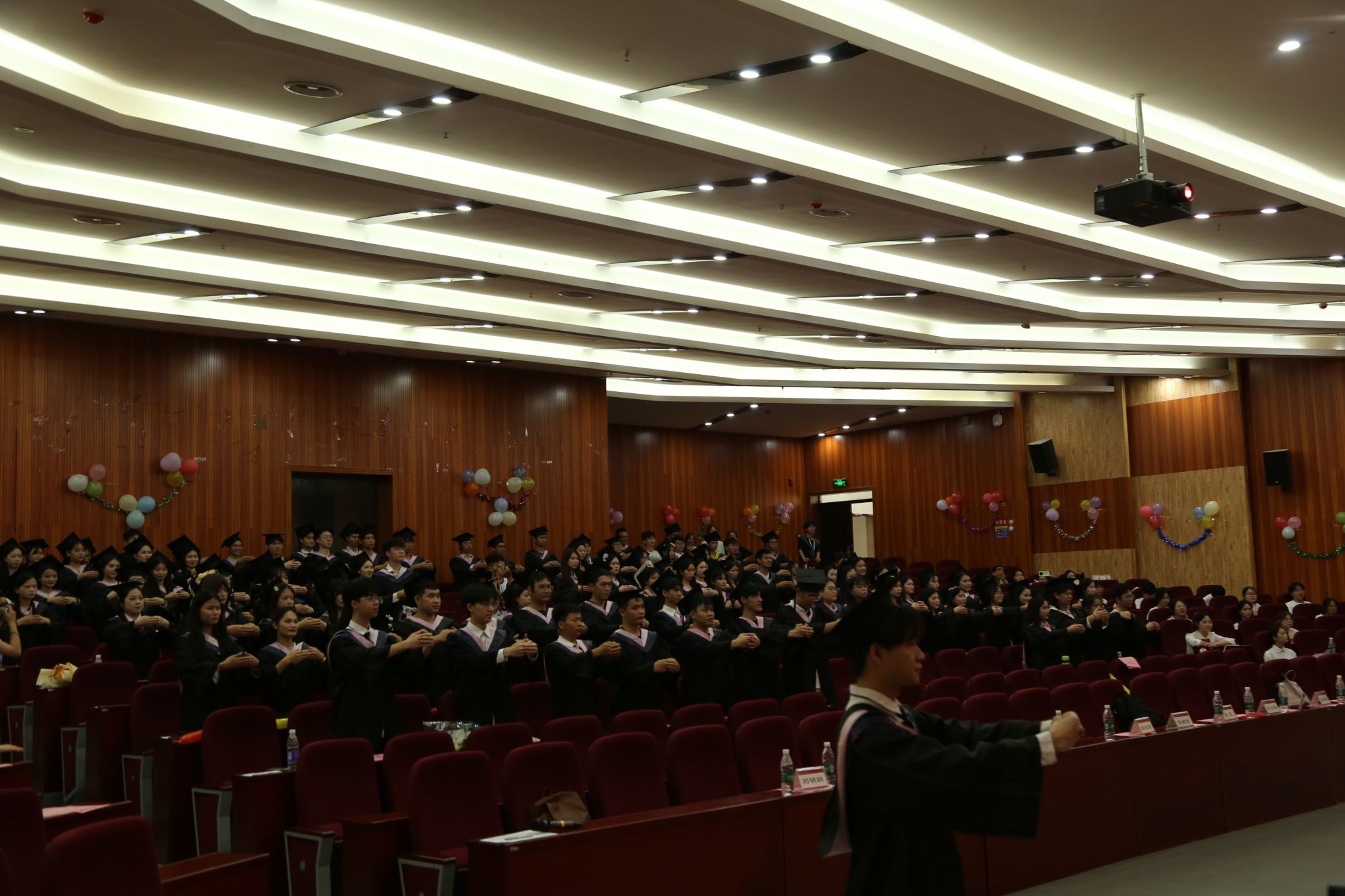 2025届毕业生代表陈经怀、谢明悦、覃华东现场演唱了《再见》《栀子花开》,代表全体毕业生向母校、向老师们表达了感恩之情。学院2022级、2023级、2024学生代表合唱《厚德载物》,为毕业的学长、学姐们送上祝福。最后,全体师生起立,齐唱校歌《芳华人间》。