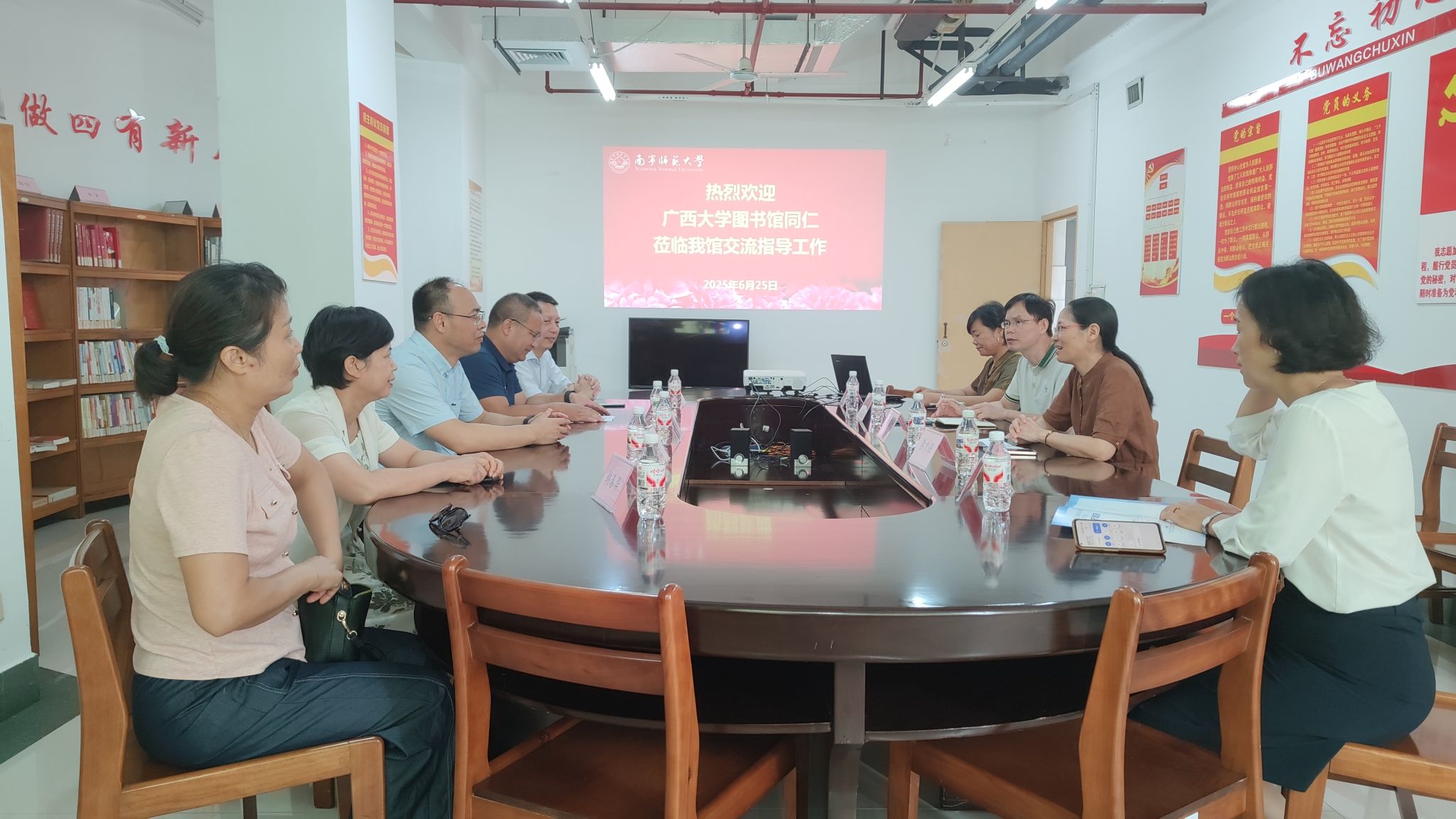 授牌仪式结束后,双方举行了座谈交流。叶佩珍对广西大学图书馆在我校设立科技查新工作分站、对我校图书馆科技查新服务工作给予大力支持表示衷心感谢。她希望两校进一步加强合作,为科研人员提供优质的查新服务。