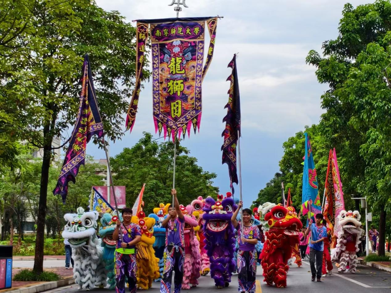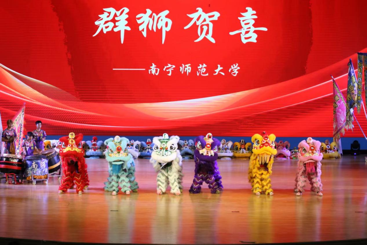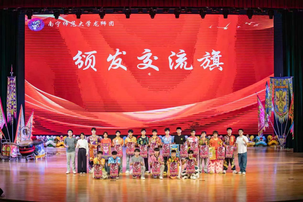 活动在各高校送来的祝贺视频中拉开帷幕,龙狮团指导老师农云霞发表致辞,为这场汇聚传统魅力与创新活力的盛会送上美好祝愿。在交流展示环节,来自15个高校的龙狮团逐一上台展示技艺,各龙狮团演员们配合默契,伴随激昂的锣鼓,醒狮灵动跃起。它们时而威风凛凛,精准地“采青”,辗转腾挪,展现出高超的技艺;时而俏皮互动,摇头晃脑、眨眼摆步,憨态可掬的模样引得现场阵阵欢笑,让大家直观感受到醒狮文化的独特魅力与活力。最终各高校龙狮团都圆满完成了演出,开幕仪式的高潮定格在情意深厚的交流旗赠礼时刻。我校龙狮团与参加本次活动的各高校龙狮团相互赠送了精心制作的交流旗,这份礼物不仅是各高校龙狮团友谊的见证,更承载着对龙狮文化传承的美好祝愿。金鼓齐鸣声中,南宁师范大学2025年龙狮文化节开幕式暨驻邕高校龙狮交流会圆满落下帷幕。