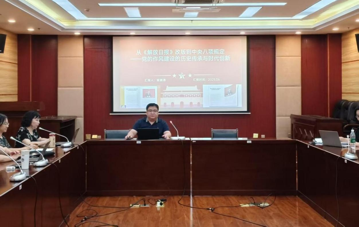 学院党委副书记、院长梁颖涛以《从<解放日报>改版到中央八项规定——党的作风建设的历史传承与时代创新》为主题,为全体教职工讲授党课。他结合党的新闻舆论工作发展历程,从《解放日报》改版讲起,回顾了党在延安时期改进新闻工作作风所取得的显著成效。他提到,通过这次改版,党的新闻工作党性、群众性、战斗性和组织性进一步增强,更加贴近实际、贴近群众,是一次具有深远意义的作风建设和思想变革。他要求,全体教职工要始终将中央八项规定视为长期有效的铁规矩、硬杠杠,以踏石留印、抓铁有痕的劲头,将其落到实处。