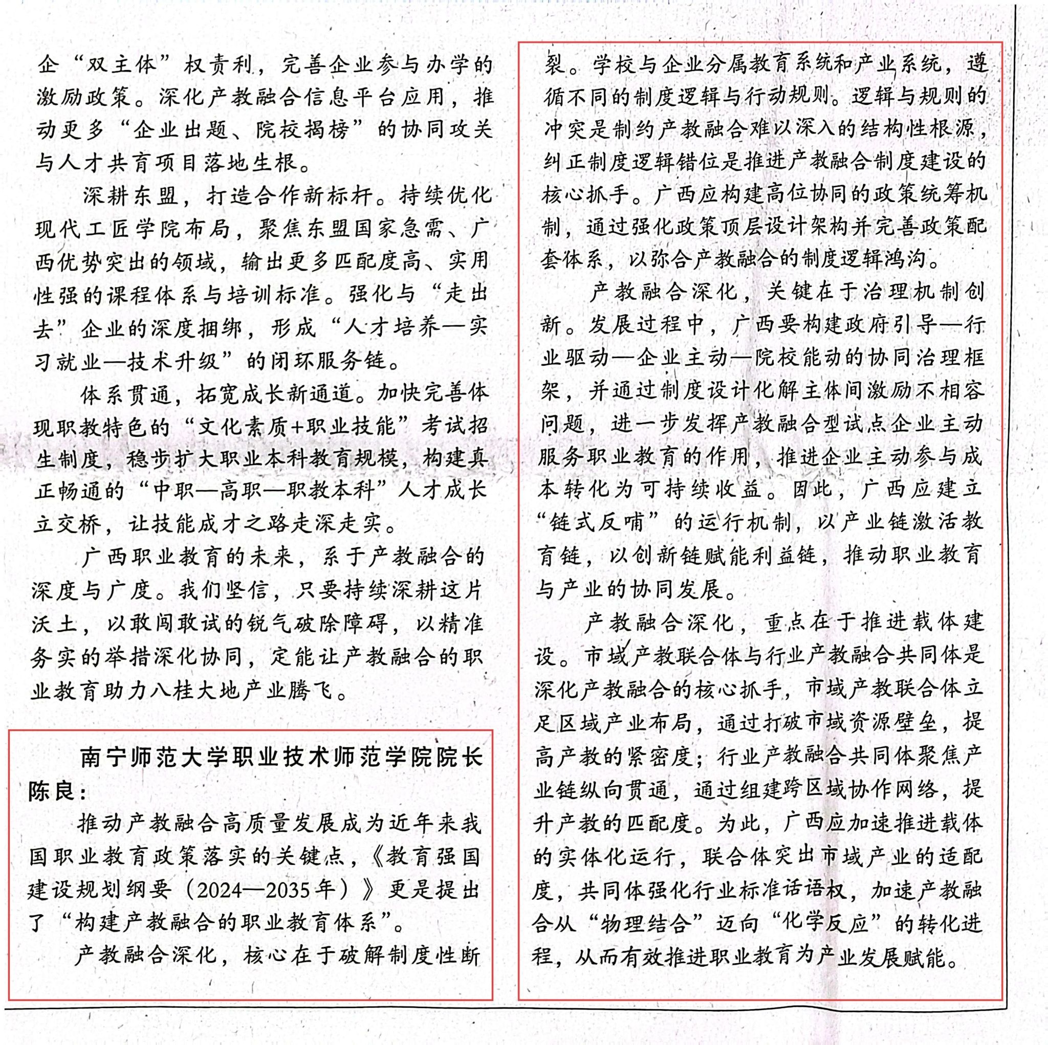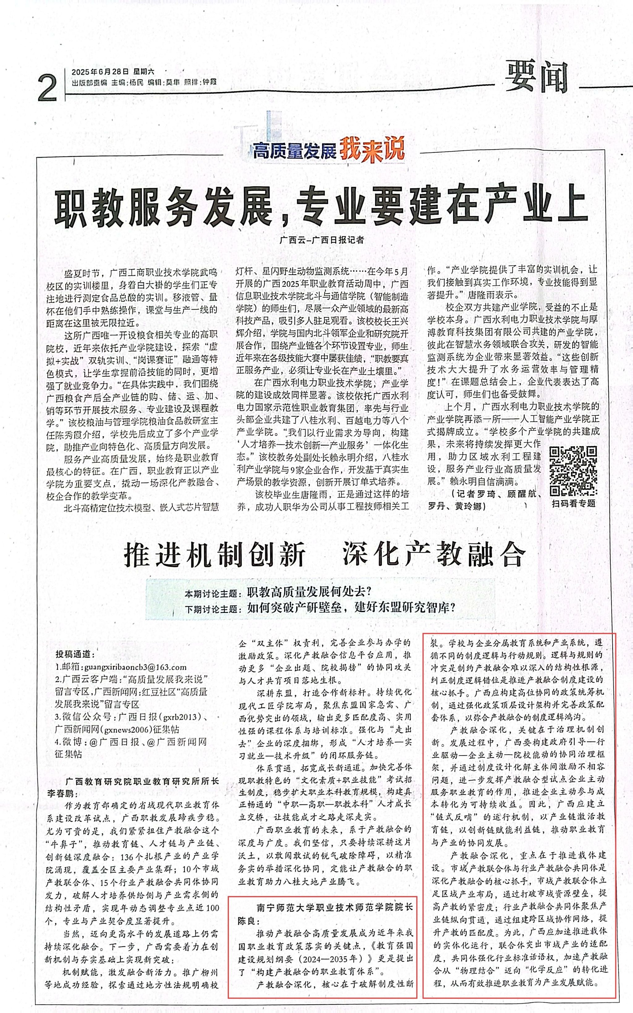 近日,我校职业技术师范学院陈良教授受邀参加《广西日报》专题访谈,围绕“职教高质量发展何处去?”主题发表了见解。陈良教授的论述既精准诊断了产教融合的制度性痛点,又提出了“政策统筹—协同治理—载体驱动”的创新路径,为广西构建产教深度融合的职业教育体系提供了兼具理论深度与实践价值的行动指南。
