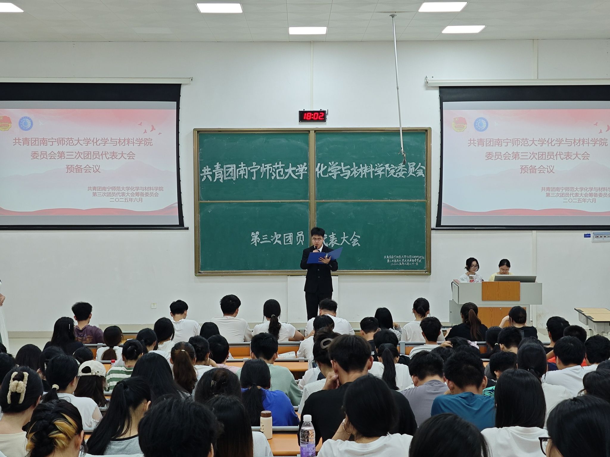 6月21至22日,共青团南宁师范大学化学与材料学院委员会第三次团员代表大会预备会议和正式会议分别在地化楼B111教室、武鸣校区图书馆报告厅召开。校团委书记区丽媛,学院党委副书记陈今浩,院团委书记王立彬老师,外院嘉宾、学院各部门代表及各班团员代表参加会议。
