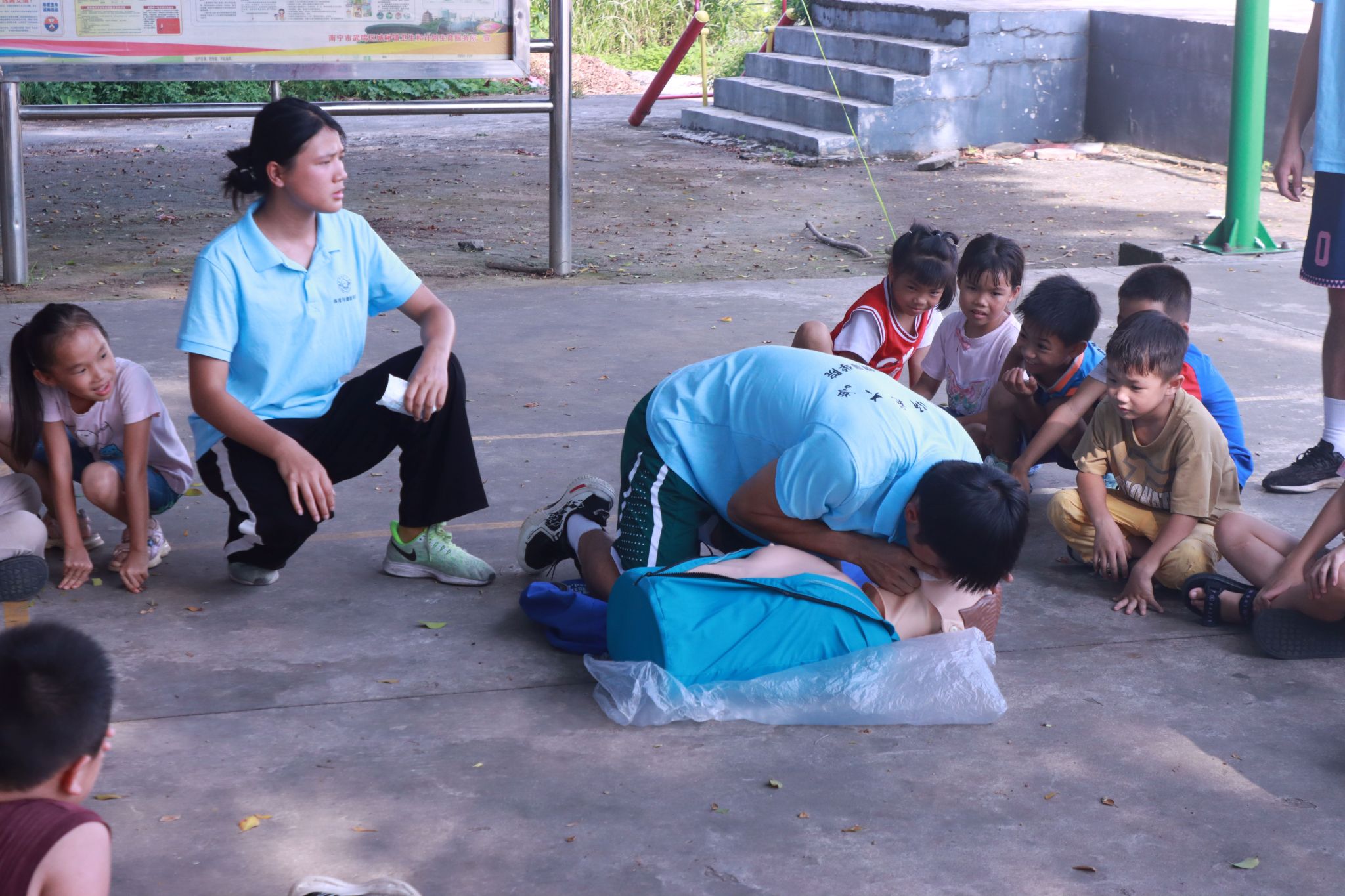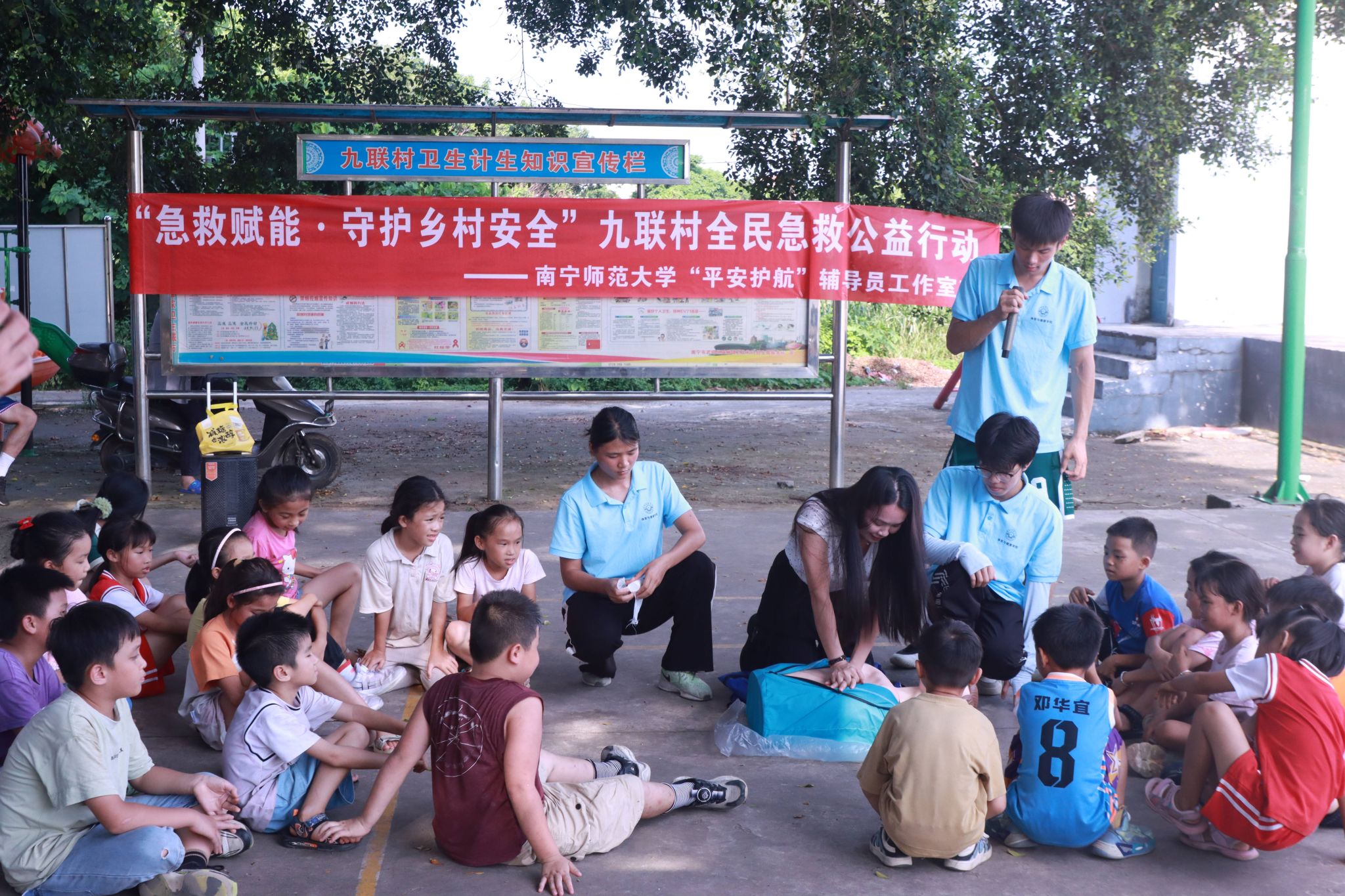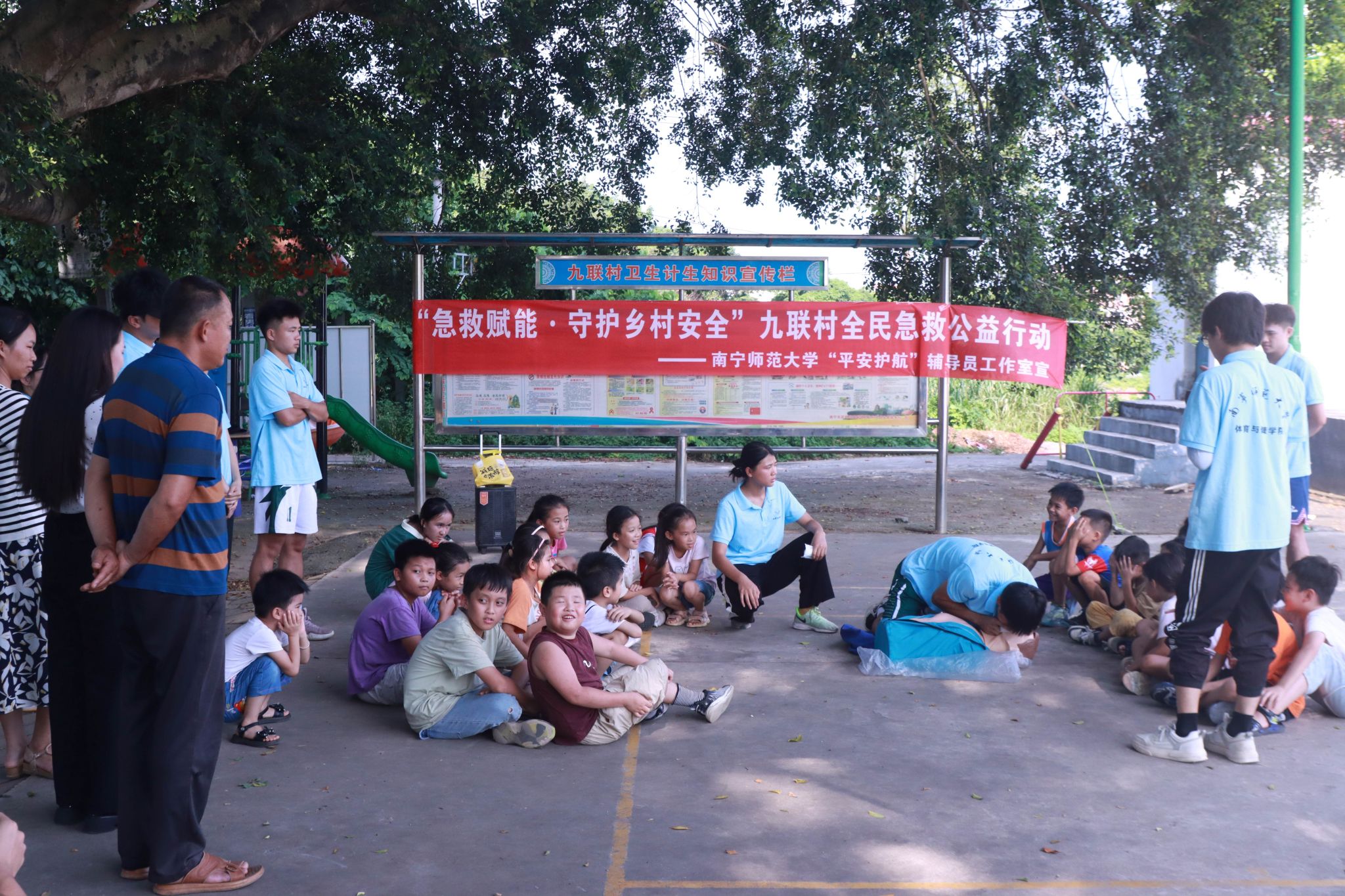 为普及防汛防溺急救知识,增强乡村小学生防灾避险能力,筑牢校园安全防线,7月17日,南宁师范大学“平安护航”辅导员工作室联合体育与健康学院“体健赋能·壮韵九联”暑期实践团在南宁市武鸣区九联村组织开展“急救赋能·守护乡村安全”九联村全民急救公益行动。急救培训由实践团队员讲解演示,九联村村委会干部、九联村部分家长及小学生参加。