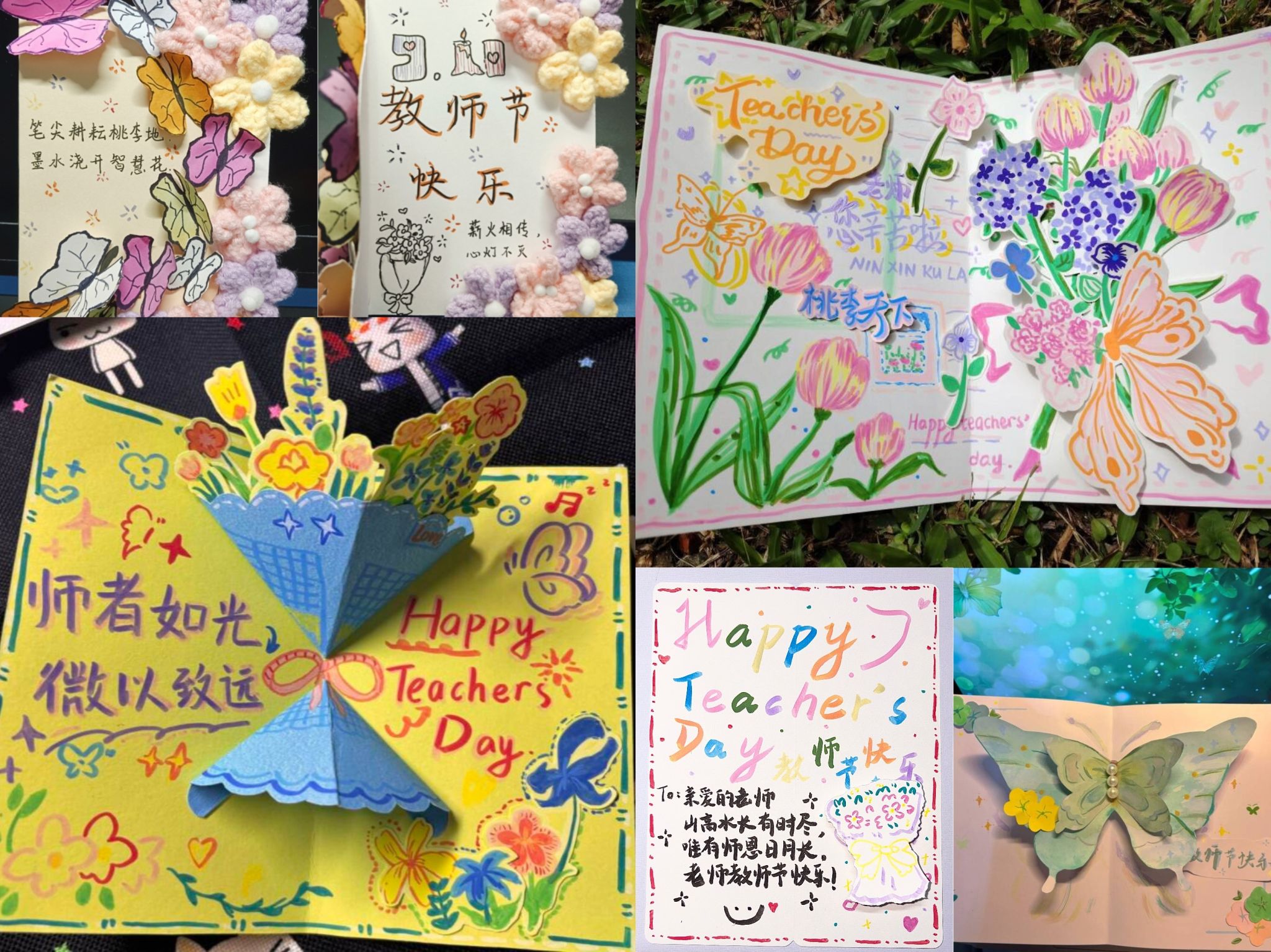 本次系列活动采取线上与线下相结合方式开展,为师生们搭建了情感交流平台。线上活动,通过撰写《南宁师范大学全体学子致老师们的一封信》,将节日的祝福与诚挚的谢意献给辛勤耕耘的全体教师;同时还开展了“师言匠心,感念有你”教师语录征集、“扭扭传情,师恩永驻”扭扭棒作品创作、“纸短情长,师恩难忘”书信征集、“师者如光,创意寄情”制作创意贺卡/书签等活动,引导同学们用笔墨书写心声、以巧手勾勒心意,让文字的温度、手作的诚意,成为对教师祝福最生动的载体。线下活动,开展了“送您一朵小红花”活动”,在教师节当天清晨,伴随着的第一缕阳光,同学们早早来到办公楼、教学楼前,为教师们献上精心准备的小红花,送上感恩师恩的祝福卡片,让真挚心意在师生间温暖传递。