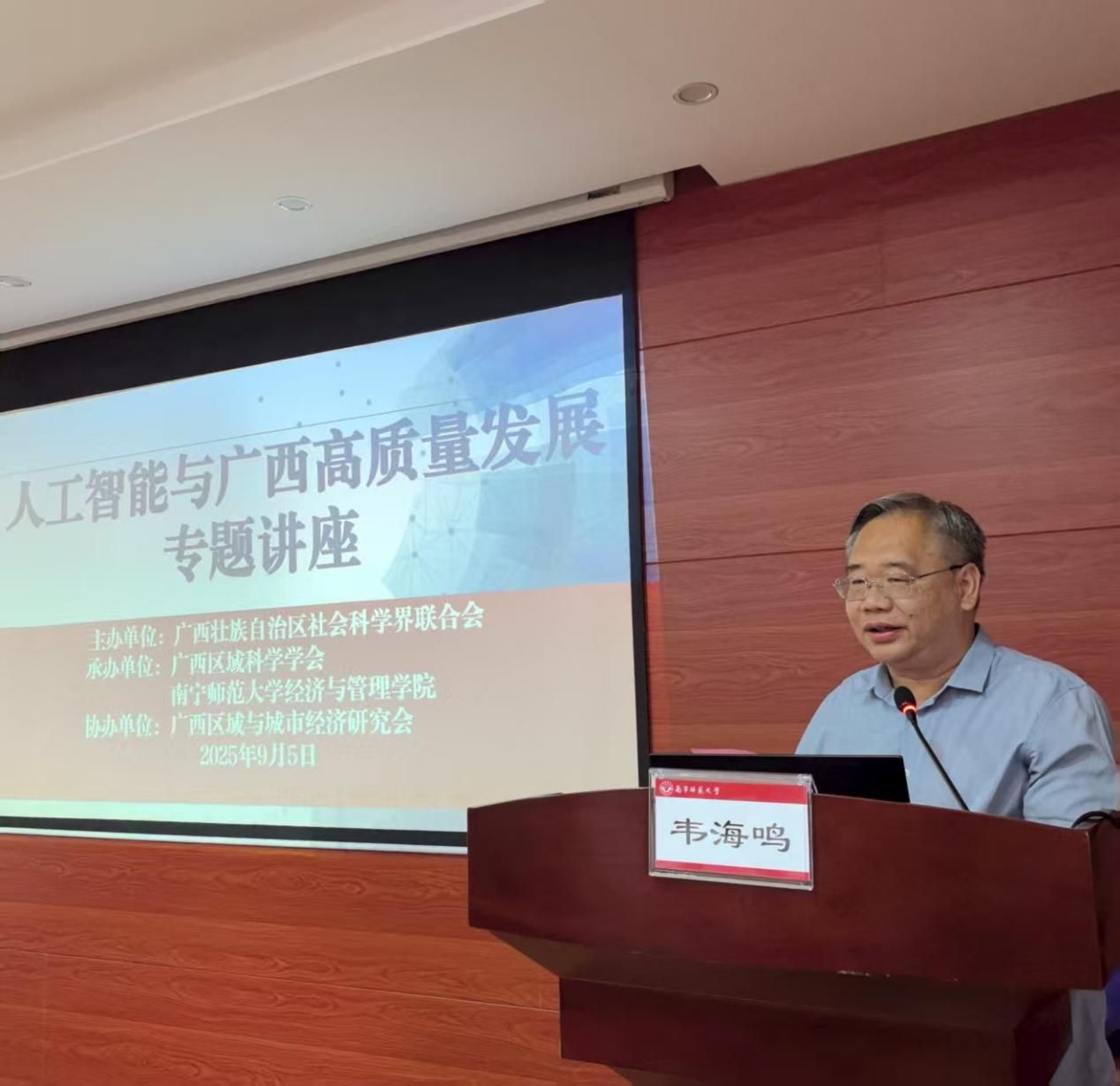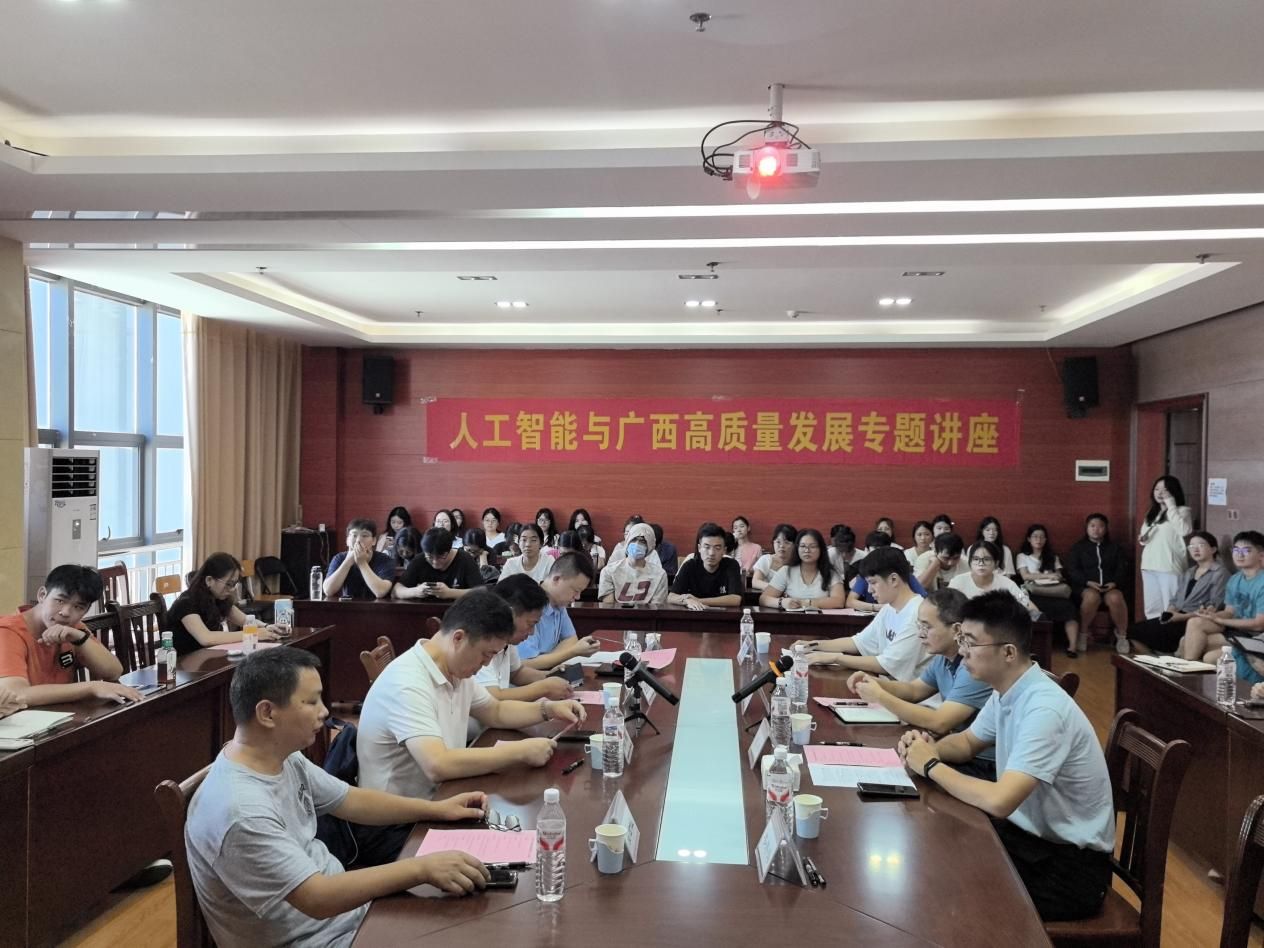 为深入学习贯彻习近平总书记关于人工智能的重要论述,贯彻落实自治区党委关于发展人工智能赋能千行百业的决策部署,聚焦人工智能与广西经济社会各领域融合发展的关键问题,探索高质量发展新路径、新动能。9月5日,由广西壮族自治区社会科学界联合会主办,广西区域科学学会与南宁师范大学经济与管理学院承办,广西区域与城市经济研究会协办的“人工智能与广西高质量发展”专题讲座在完美(中国)五合校区顺利举行。本次讲座由经济与管理学院党委书记韦海鸣教授主持,来自校内外专家、学者约60人参会。
