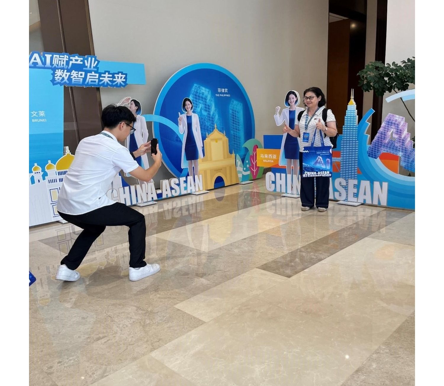 从15日大会筹备到大会顺利举办,志愿者们听从指挥、服从安排,在各自的服务岗位上以饱满的热情和良好的态度为参会嘉宾提供帮助。会议前夕,他们协助布置会场、仔细核对座次、分装物料,确保每一份“AI显眼包”都能准确无误地送到嘉宾手中。会议当天,志愿者们以最饱满的精神状态迎接八方来客。他们承担起动线指引、疑问解答、宣传AI互动拍照设备等重要工作,还热情引导嘉宾和数字人“智妍博士”及东盟国家标志性建筑牌拍照打卡留念。现场欢声笑语不断,科技与人文实现了温暖的交融。