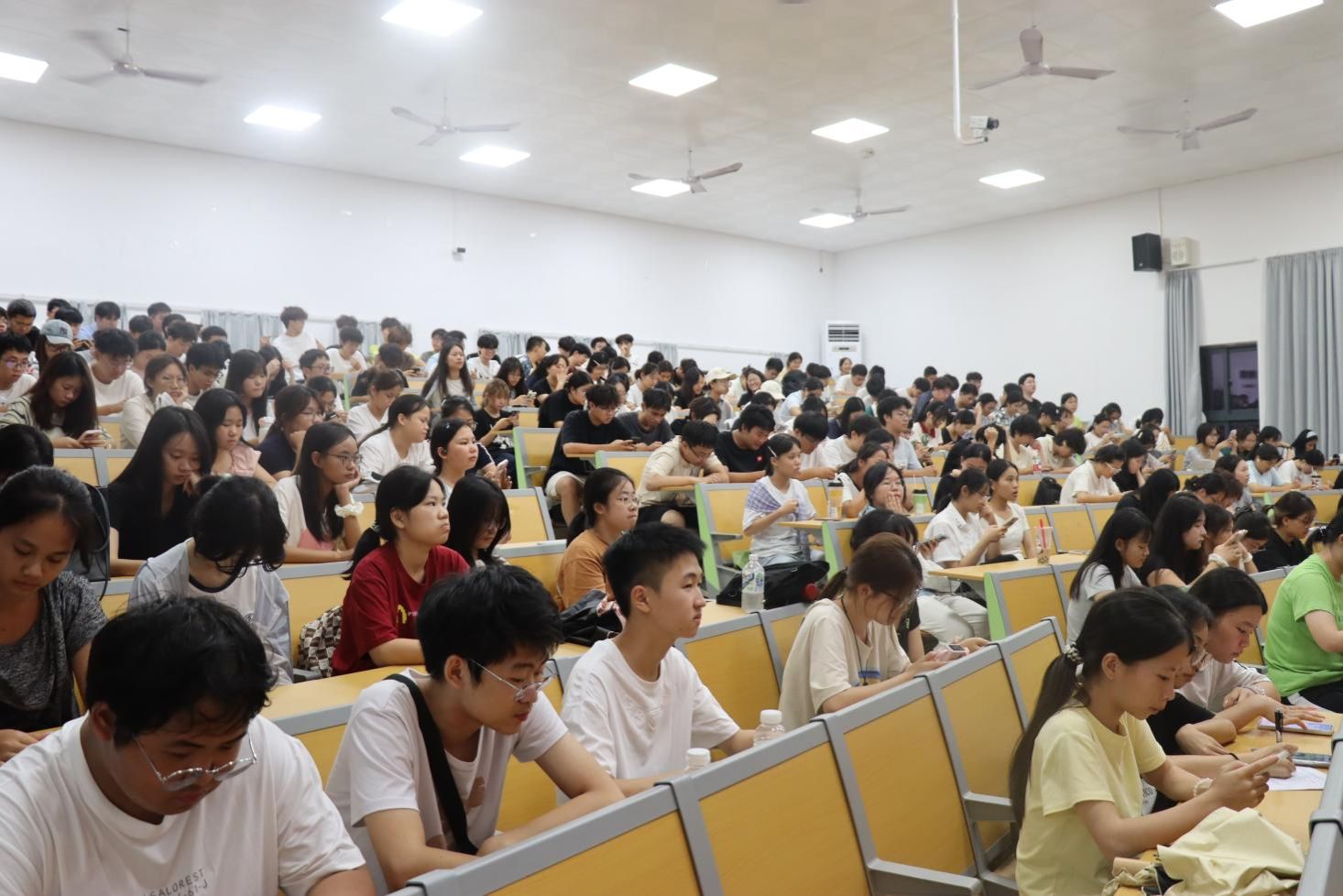 彭定新老师围绕“为什么要入党”、“如何才能入党”、“党员发展流程”等关键内容展开系统讲解。他首先从个人成长、社会责任、理想信念等多个层面阐述了入党的意义,引导同学们端正入党动机。随后,彭老师鼓励同学们认真参加政治理论学习,努力学习,积极参与志愿服务和社会实践,不断提升自身综合素质,为争取入党创造条件。最后,他详细介绍了入党申请、积极分子培养、发展对象考察、预备党员接收及转正等环节的具体流程与要求。整场党课内容详实、逻辑清晰,现场秩序良好。新生们认真听讲、积极记录,展现出强烈的学习热情。
