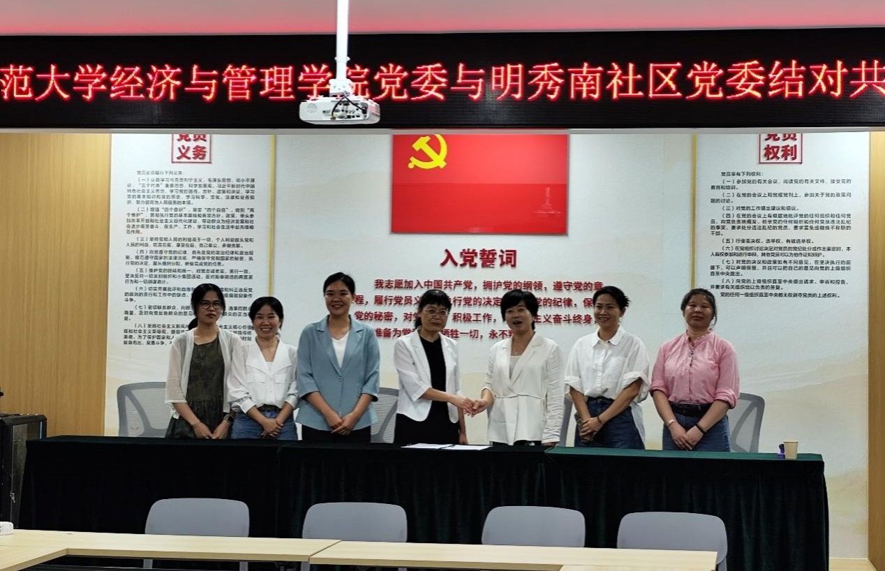为深入贯彻党建引领基层治理与高校服务社会发展协同推进的工作要求,促进高校与社区资源共享、优势互补,2025年9月23日下午,南宁师范大学经济与管理学院党委与明秀南社区党委结对共建签约仪式在明秀南社区党群服务中心举行。经济与管理学院党委副书记、院长何玲玲,北湖街道党工委副书记、纪工委书记林洁,明秀南社区党委书记、居委会主任杨芳洁出席仪式,双方党务工作者、教师代表及学生骨干共50余人参加活动。