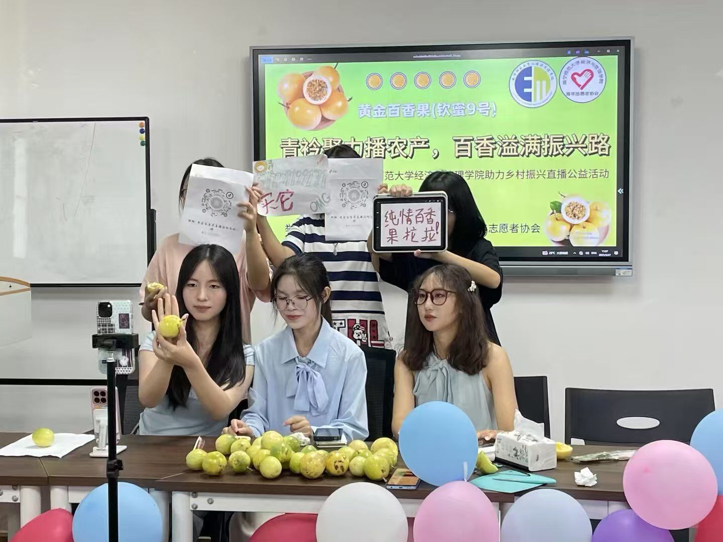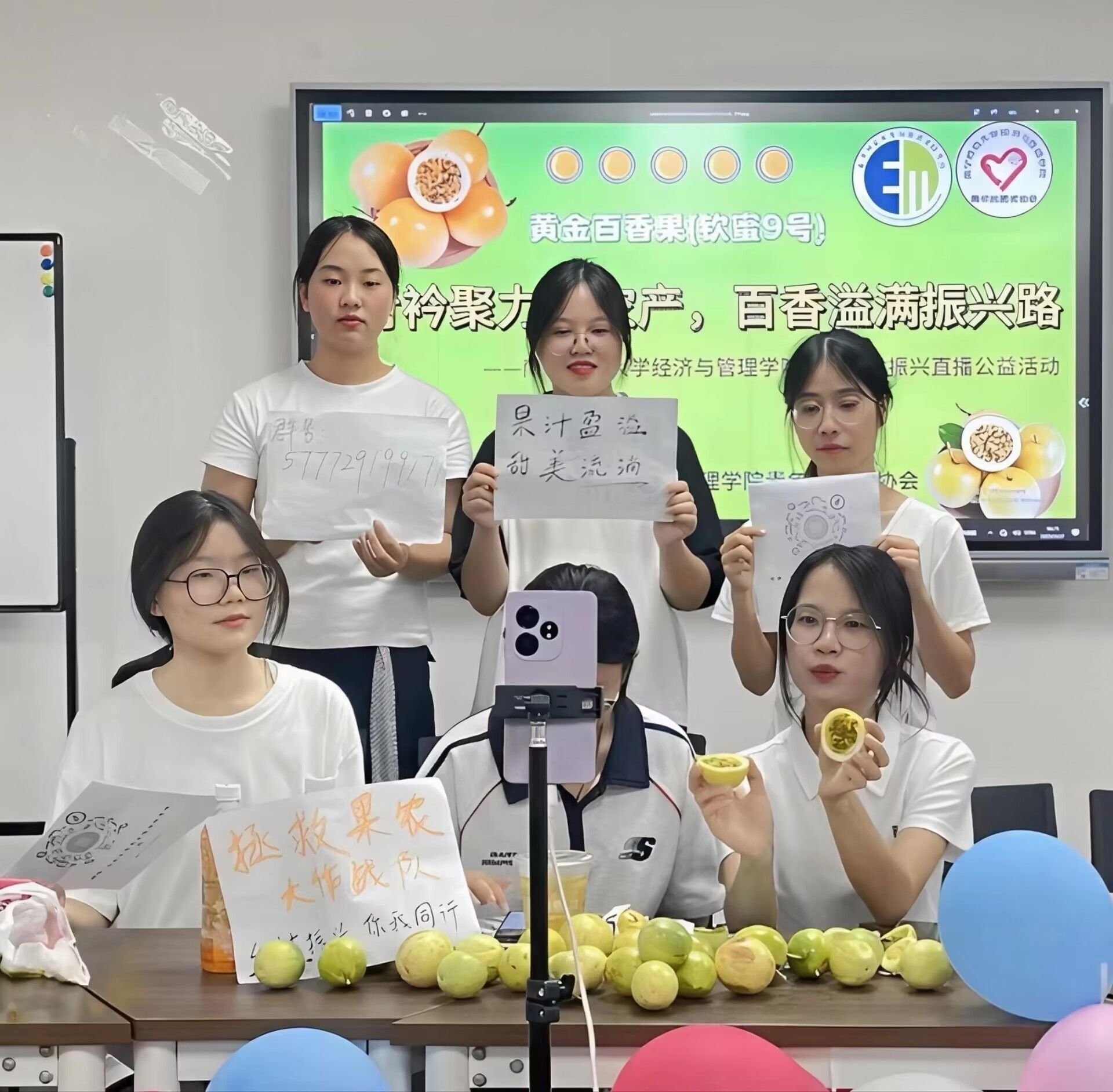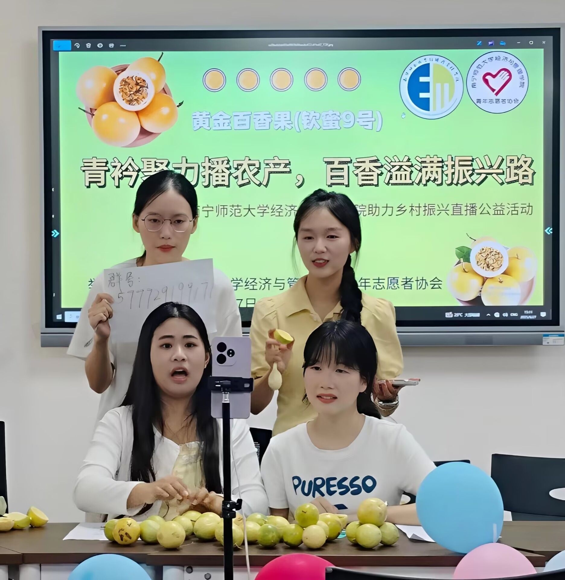 为积极响应国家乡村振兴战略,拓宽农产品销路,带动农户增收,南宁师范大学经济与管理学院青年志愿者协会于2025年9月27日开展以“青衿聚力播农产,百香溢满振兴路”为主题的百香果直播助农大赛。