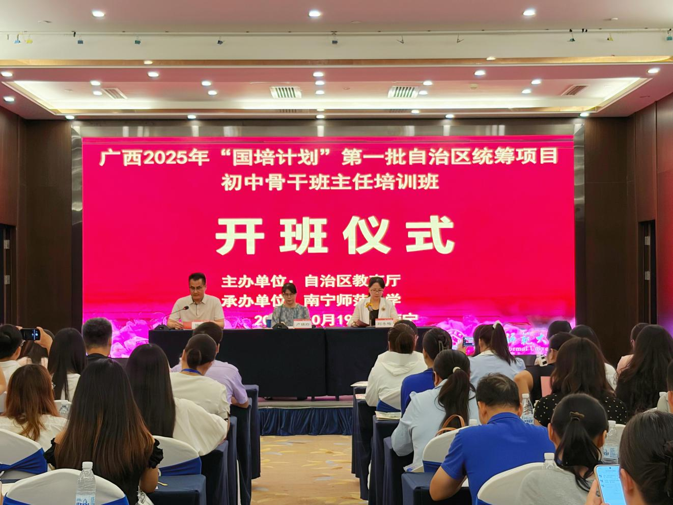 为进一步提升广西初中骨干班主任的专业素养与班级管理能力,10月19日下午,由自治区教育厅主办、南宁师范大学承办的“广西2025年“国培计划”第一批自治区统筹项目——初中骨干班主任培训班”在南宁顺利开班。南宁师范大学初等教育学院副院长卢锦珍、项目首席专家兼教学班主任刘冬梅、南宁师范大学小学教育研究中心副主任陈强及来自广西各地的120位初中骨干班主任参加了此次培训班的开班。