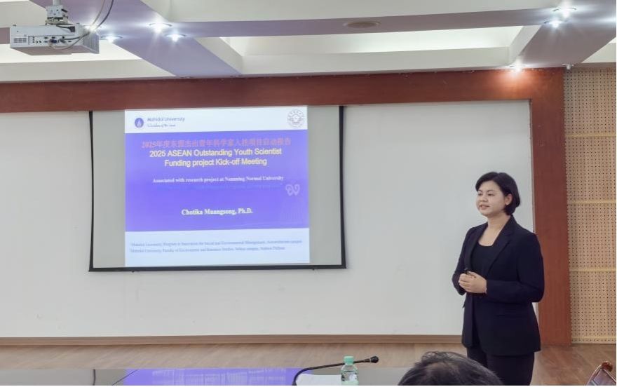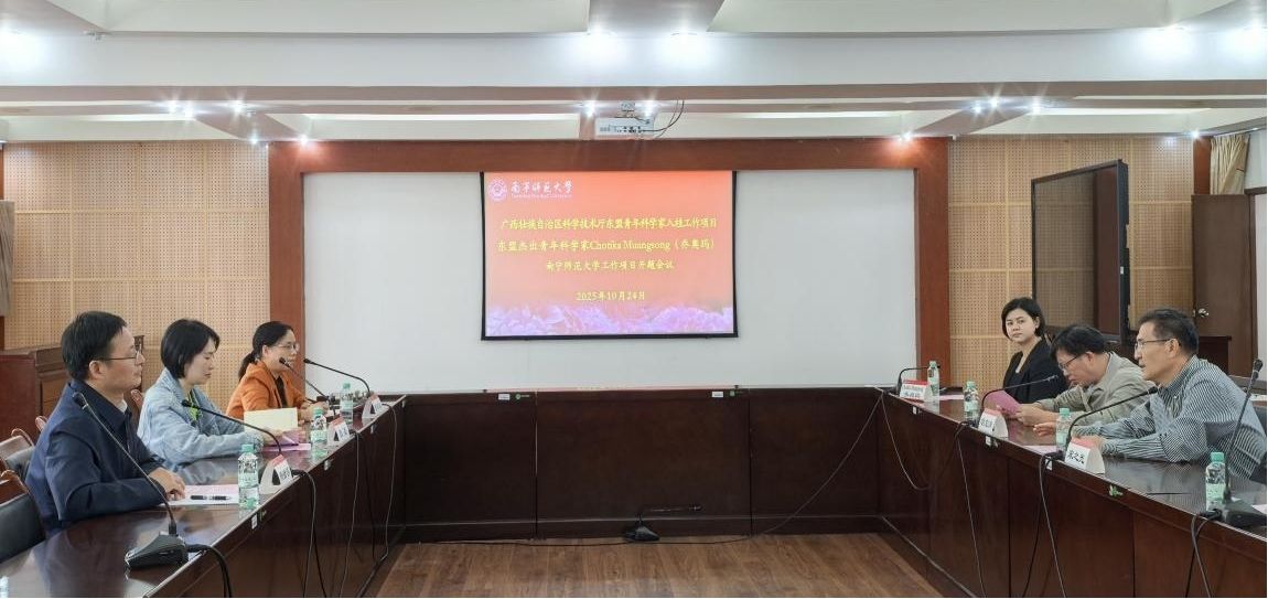 10月24日下午,广西壮族自治区东盟杰出青年科学家入桂工作项目——南宁师范大学2025年度引入的东盟杰出青年科学家泰国玛希隆大学Chotika Muangsong(乔奥玛)博士合作项目开题会议顺利举行。会议由我校科研管理处处长黄燕敏教授主持。广西科技厅东盟技术转移中心国际合作部项目主管张夏、南宁师范大学国际交流合作处处长杨绪明教授、地理与海洋研究院院长胡宝清教授、项目合作团队负责人宋之光教授及团队成员等共同参会。