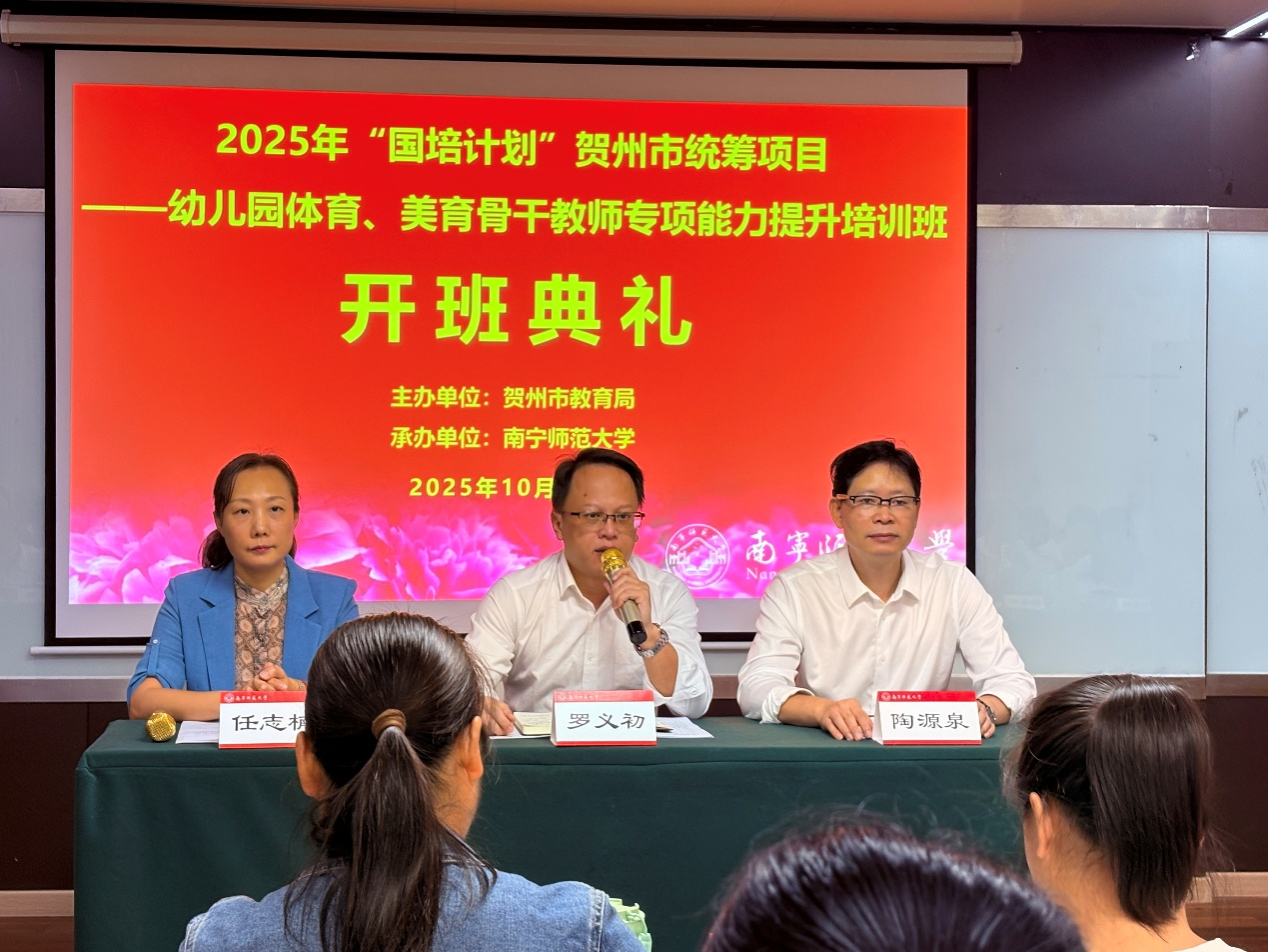 10月28日,2025年“国培计划”贺州市统筹教师培训项目——幼儿园体育、美育骨干教师专项能力提升培训班正式开班。此次培训由南宁师范大学承办,旨在通过系统的培训课程,提升贺州市幼儿园体育、美育骨干教师的专业能力,推动幼儿园体育与美育教育的高质量发展。开班典礼由南宁师范大学教育科学学院任志楠副教授主持。
