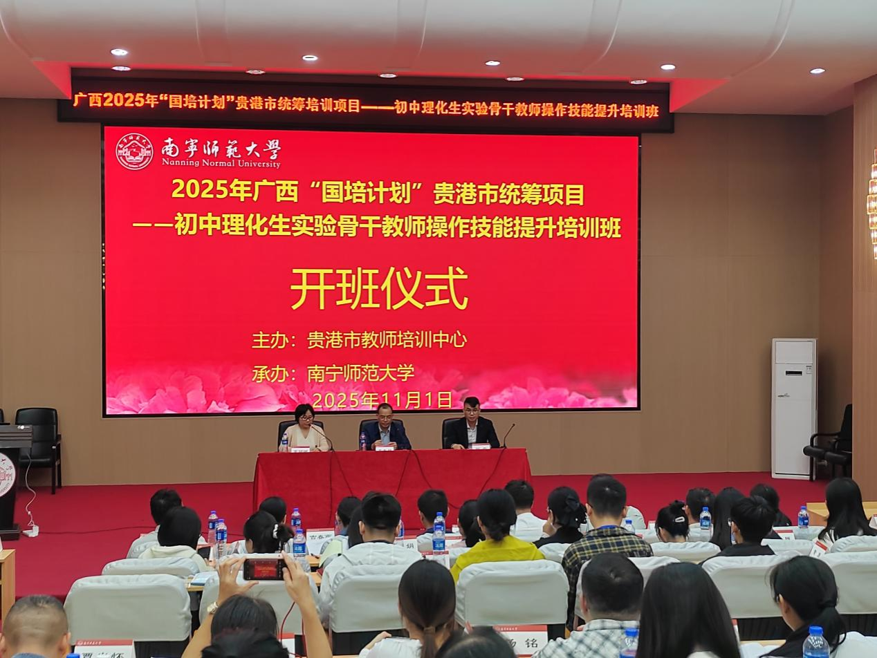 由贵港市教育局师培中心主办、南宁师范大学环境与生命科学学院承办的广西2025 年“国培计划”贵港市统筹项目--初中理化生实验骨干教师操作技能提升培训班在南宁市正式拉开帷幕。南宁师范大学环境与生命科学学院党委书记韦东林、贵港市教育局师培中心刘崇主任以及来自贵港市各县区的60位初中理化生实验骨干教师共同出席了开班仪式。