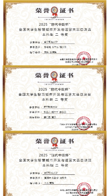 2025年11月1日,南宁师范大学自然资源与测绘学院房地产开发与管理专业学生参加了2025“现代中欧杯”全国大学生智慧城市开发与运营大赛全国总决赛,由娄信强主任,黄乐老师,许杰老师指导的3支队伍在本次比赛中表现卓越,荣获全国二等奖3项。