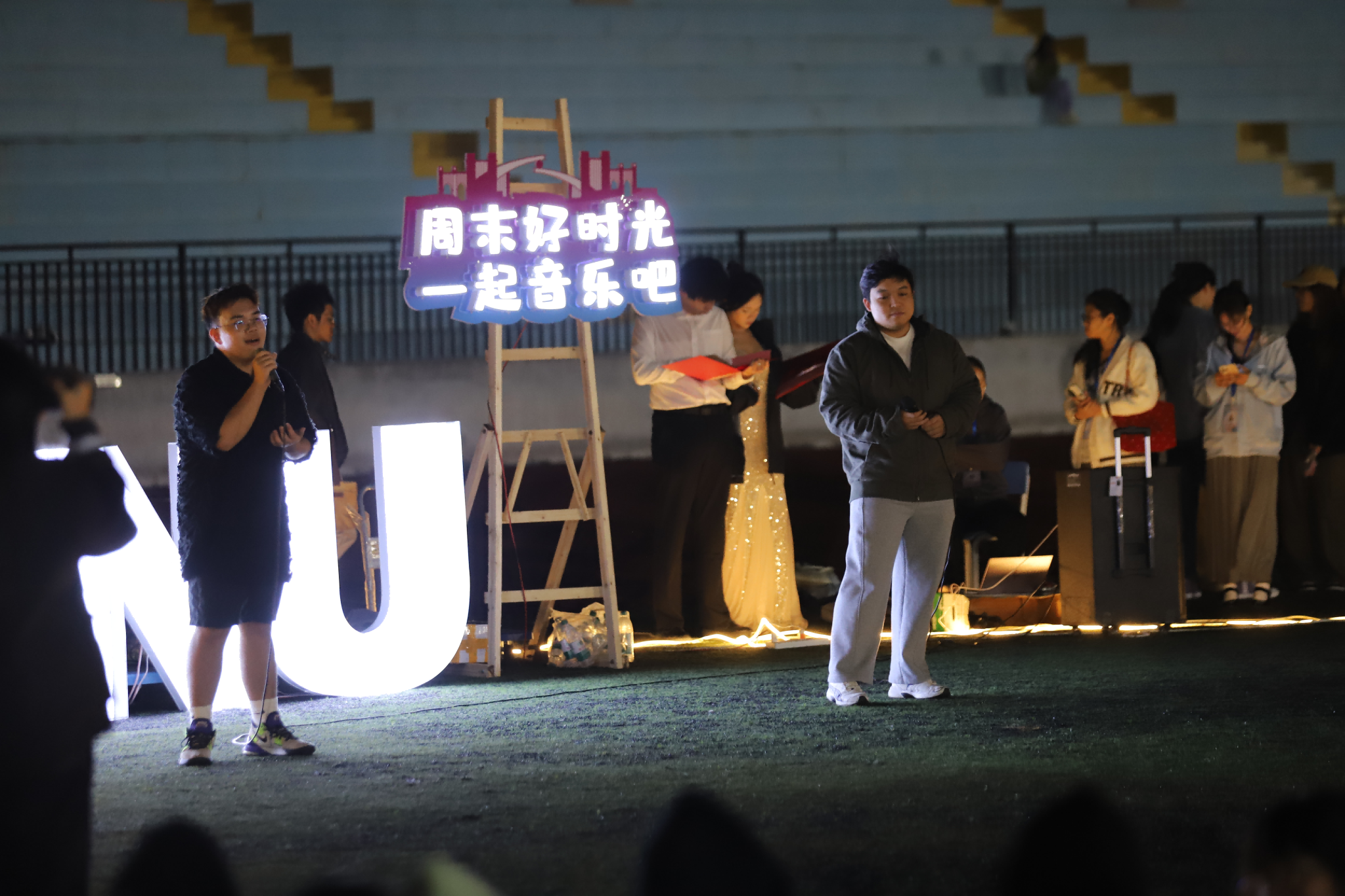 2025年11月2日晚,由校团委主办,法学与社会学院承办的“周末好时光·一起音乐吧”第四期美育实践课堂在五合足球场顺利举行。本次活动旨在通过音乐与艺术展演丰富校园美育实践形式,提升学生审美素养,营造积极向上、充满活力的校园文化氛围。