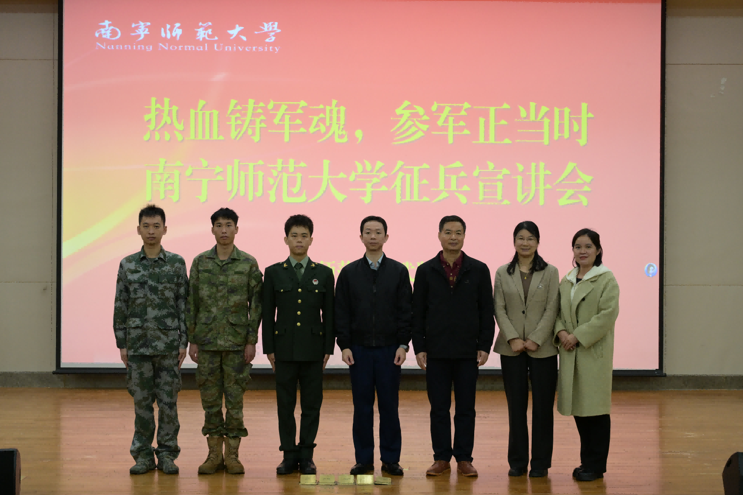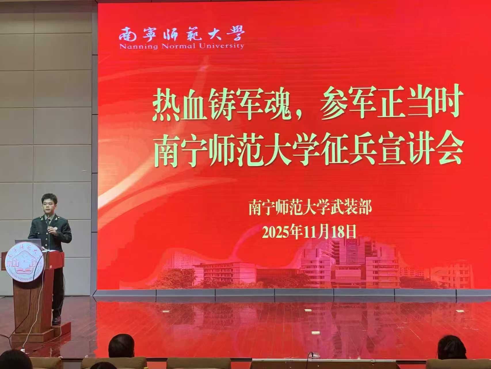 为深入贯彻新时代习近平强军思想,激发青年学子投身国防建设的使命担当,2025年11月18日,南宁师范大学武装部以“热血铸军魂,报国正当时”为主题,在武鸣、五合两校区分别举行征兵宣讲会。此次活动旨在引导广大学子将个人理想融入强国强军伟业,现场气氛庄重热烈,充分展现了新时代青年胸怀家国、勇于担当的精神风貌。