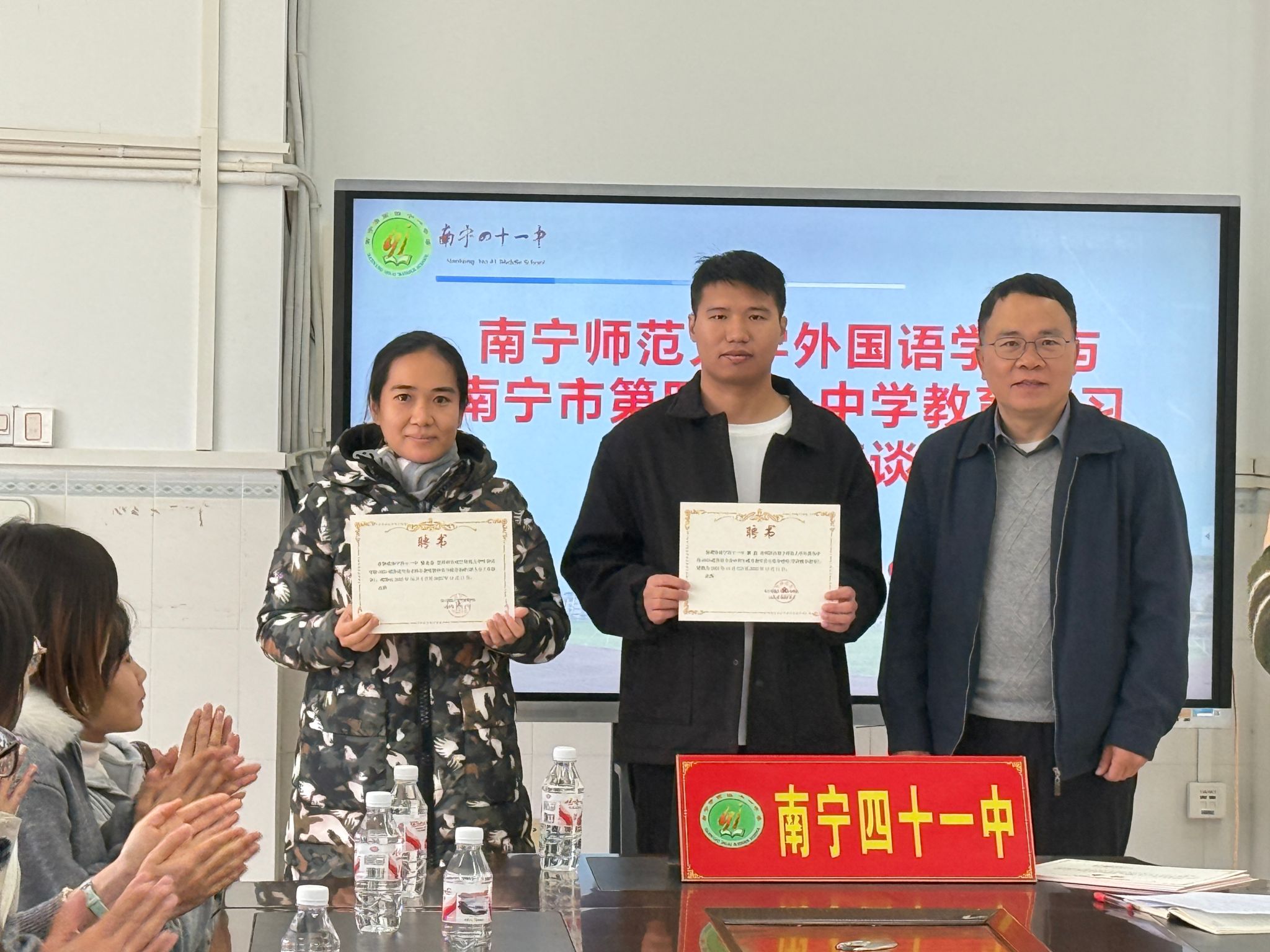 会议特别环节中,苏华书记为指导教师和班主任颁发聘书,以表彰他们在南宁师范大学外国语学院人才培养工作中的重大作用。颁发聘书仪式不仅体现了学院对一线教师付出的高度认可,也进一步加强了校地合作与教育实践的紧密联系。
