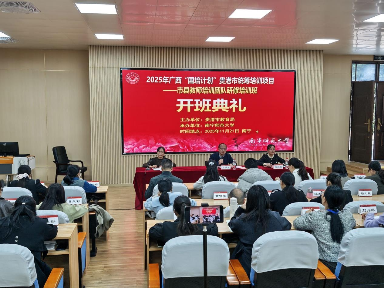为进一步加强贵港市教师培训团队专业化建设,提升区域教师培训质量与水平,11月21日下午,2025年贵港市统筹培训项目——市县教师培训团队研修培训班开班典礼在我校举行。我校教务处覃城阜处长、本次培训专家团队成员及班主任代表参加典礼并致辞,来自贵港市港北、港南、覃塘三区的70名教师培训团队主要成员齐聚一堂,正式开启为期10天的研修学习。