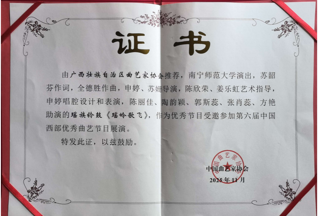 11月11日至14日,由中国曲协、四川省文联主办的第六届中国西部优秀曲艺节目展演于在四川巴中举行。由广西曲协选送,经全国范围内遴选,南宁师范大学表演的瑶族铃鼓《瑶岭歌飞》成功入选此次展演。