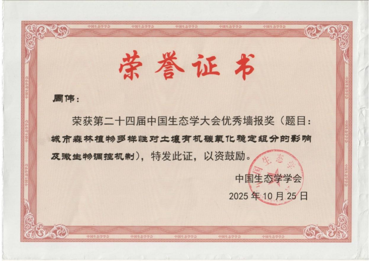 两位同学分别依托立项的国家级、自治区级大学生创新创业训练计划项目,在周伟老师的悉心指导下,围绕城市森林土壤固碳功能及其微生物驱动机制这一前沿主题,完成了从实验设计到数据分析的科研训练,取得初步创新成果。此次获奖既是对学生个人科研潜力与专业素养的肯定,也彰显了环境与生命科学学院本科生创新创业培养成效。