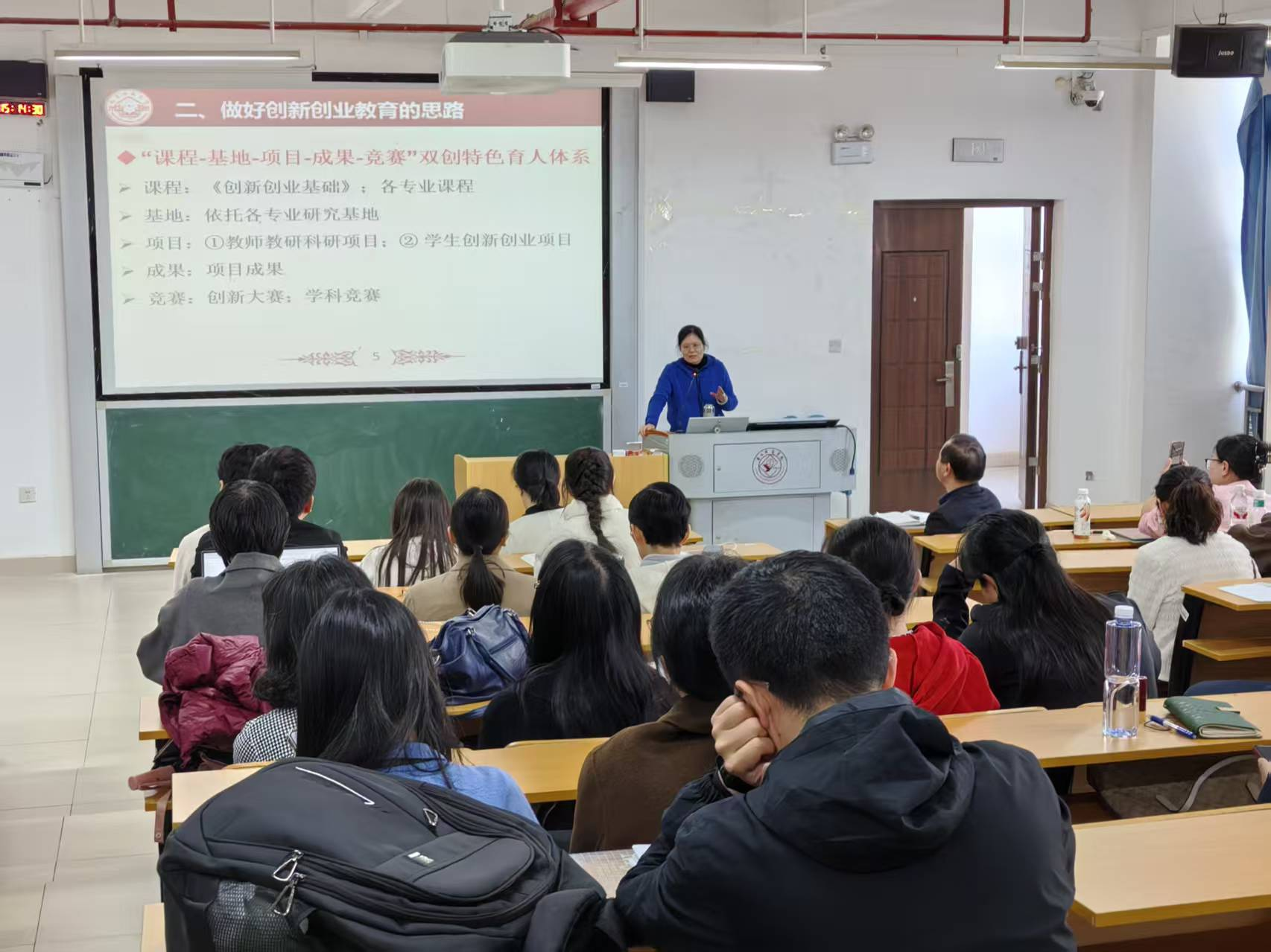 在培训会上,陈文琼教授首先强调了创业创业教育的重要意义,并解读了最新政策要求,帮助教师们指导大学生把握创新创业计划项目的方向与标准,强调项目需紧密结合社会需求和学科前沿。陈教授以获得广西赛区金奖的项目“山歌嘹亮,非遗普法民族边关行”为例,系统阐述了如何将非遗文化、地方特色与法治宣传相结合,打造具有社会影响力的创新实践品牌。陈教授结合成功的案例,详细讲解了项目选题、团队组建、资源整合等关键环节,为师生提供了可复制的实践范本。