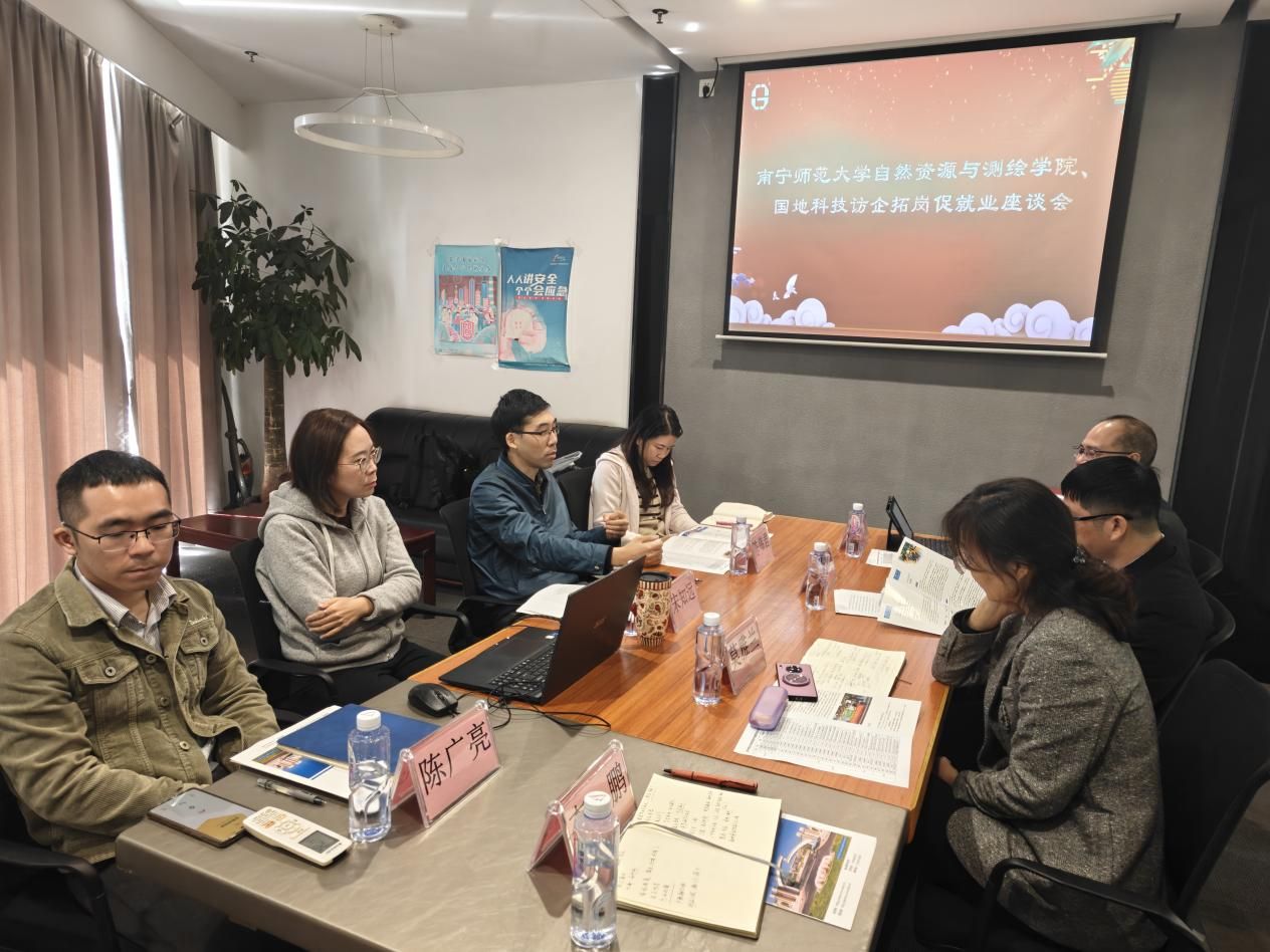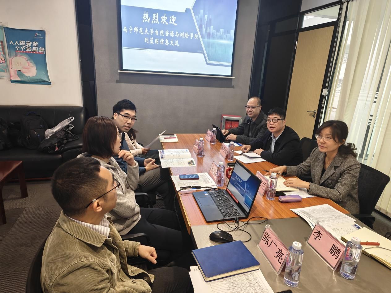 随后,调研团队到访广州蓝图地理信息技术有限公司。蓝图信息作为业内知名的地理信息工程技术与服务提供商,其业务领域与学院专业设置高度契合。在参观企业展厅和技术部门后,双方举行了务实的工作会谈。莫雅兰就学院学生就业意向、职业发展特点与企业进行了沟通,希望企业能为学院学子提供更多优质的实习与就业岗位。土地管理专业系主任刘少坤和、测绘工程专业副主任李鹏则分别结合土地资源管理、测绘工程的专业特点,就课程设置如何更好对接行业前沿技术、实践教学环节如何与企业项目深度融合等议题,与企业技术专家和管理者交换了意见。蓝图信息相关负责人表示,公司正处于快速发展期,对人才持欢迎态度,同时对测绘工程专业岗位人才缺口较大,非常期待能与南宁师范大学自然资源与测绘学院建立长期稳定的合作关系,欢迎更多优秀学子加入。