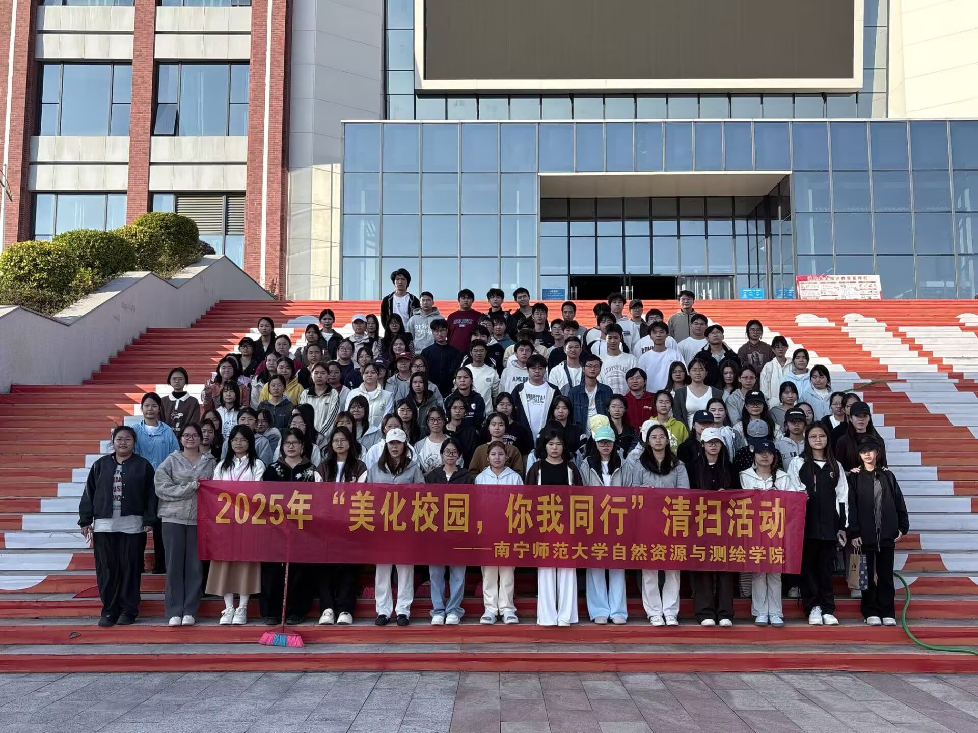 活动当天,24级各班同学们分别负责武鸣1号教学楼1楼、武鸣2号教学楼1楼、行政楼等区域。大家手持扫帚、垃圾铲等工具,分工明确、协作默契:有的弯腰清扫落叶、捡拾垃圾,有的深入绿化带清理隐藏的杂物。针对操场的散落垃圾,大家采用“拉网式”清理,确保不留卫生死角。经过同学们的辛勤劳动,为营造良好的校园环境贡献了一份力量。
