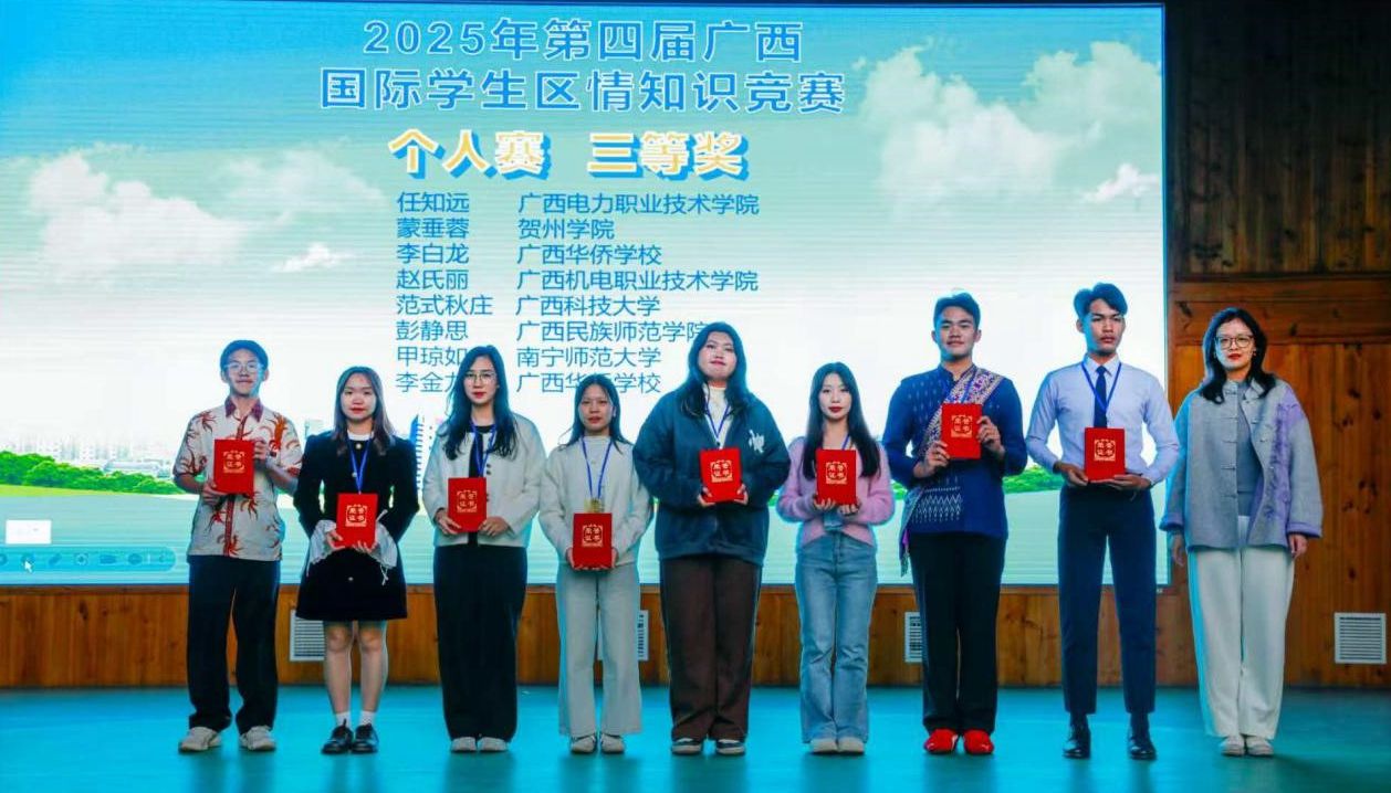 为丰富国际学生的校园生活,增进其对中国的国情、区情与时事的了解,提升对广西及中国的认同感与热爱,培养更多知华友华的国际人才,11月27日至28日,广西高等教育学会外国留学生教育管理专业委员会在柳州城市职业学院成功举办了主题为“国际学生看美丽广西”的第四届广西国际学生区情知识竞赛。本届赛事由柳州城市职业学院国际教育学院承办,吸引了区内众多高校的国际学生同台竞技。我校选派的三名优秀国际学生—甲琼如、黄氏庄和孙凤萍在团体赛中力拔头筹,荣获一等奖。在个人赛环节中,我校甲琼如同学获三等奖,孙凤萍和黄氏庄两位同学获得优秀奖。