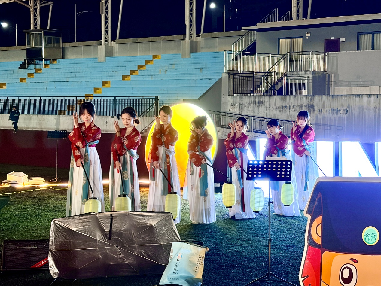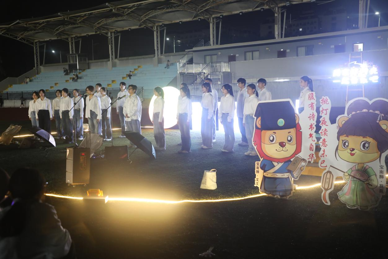 中场休息时“听歌识曲”游戏激发了观众的热情,抢答十分激烈,现场气氛瞬间升温。合唱《这世界那么多人》《一程山路》的和声里,观众们挥动手中的荧光棒轻唱应和;SPADE-ACE乐队带来的《潜蓝色》《不该》以器乐的碰撞点燃现场氛围,鼓点与吉他的音浪里,观众的呐喊此起彼伏。从国风雅韵到流行旋律,从舞台律动到协作展演,同学们以艺术为笔,在夜色里绘就“以美育人”的鲜活图景。