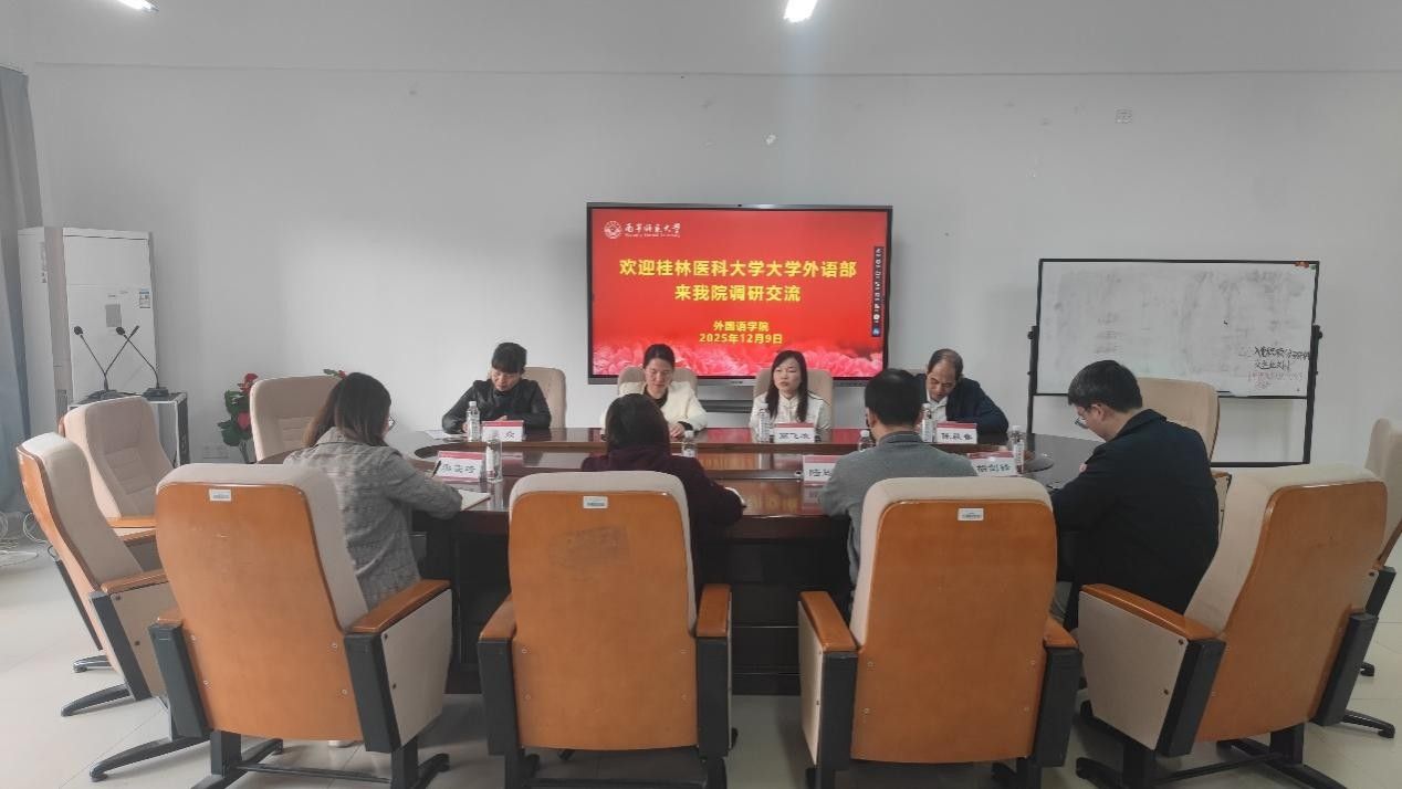 12月9日上午,桂林医科大学大学外语部梁雪清主任一行4人到我校外国语学院进行交流座谈。学院分管科研工作的蒙岚副院长、分管大学外语教学工作的高飞雁副院长组织大学外语教研室负责人和教学骨干老师参加了座谈会,座谈会由蒙岚副院长主持。
