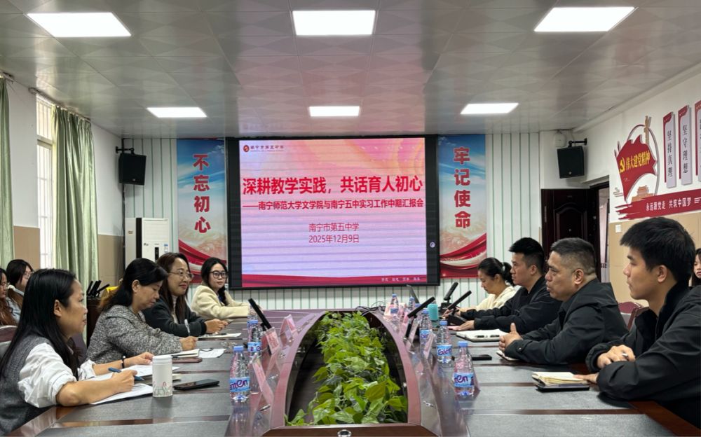 2025年12月5日,南宁师范大学文学院与南宁市第五中实习工作中期汇报会在南宁五中图书馆六楼会议室举行,由南宁五中教务处莫庆信副主任主持。五中校长蒋振恩、副校长陈耀康、指导教师代表,文学院副院长张淑云、实习带队教师、实习学生齐聚。