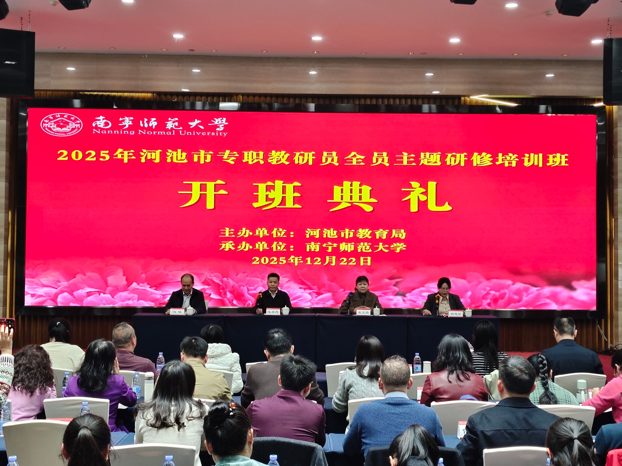 为深入贯彻落实国家教育方针,推动新时代基础教育教研工作高质量发展,12月22日下午,由河池市教育局主办、南宁师范大学承办的2025年河池市专职教研员全员主题研修培训班在南宁顺利开班。中共河池市委教育工作领导小组办公室副主任陈厚德,南宁师范大学教师教育学院院长王文蓉,河池市教育科学研究所所长冯斌,副所长明慧芬等领导出席开班典礼。典礼由明慧芬副所长主持。