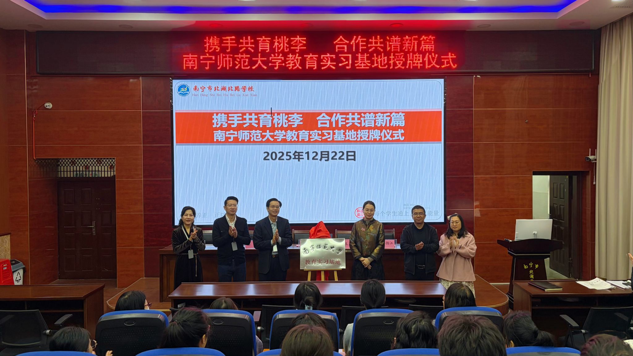 随后,韦扬江副院长代表我校向北湖北路完美(中国)授予“南宁师范大学教育实习基地”牌匾,双方领导共同揭牌,标志着两校合作进入实质性阶段。
