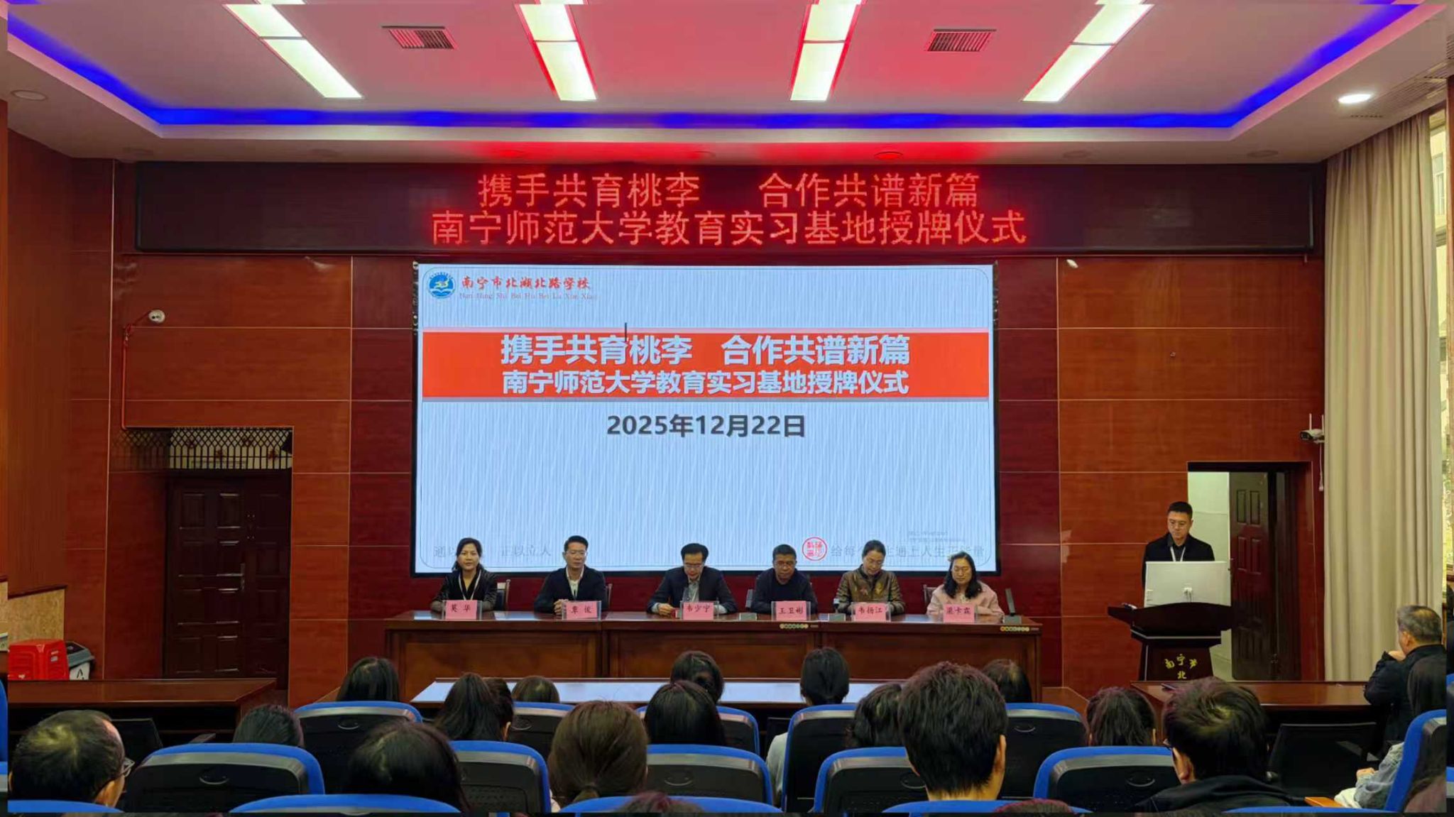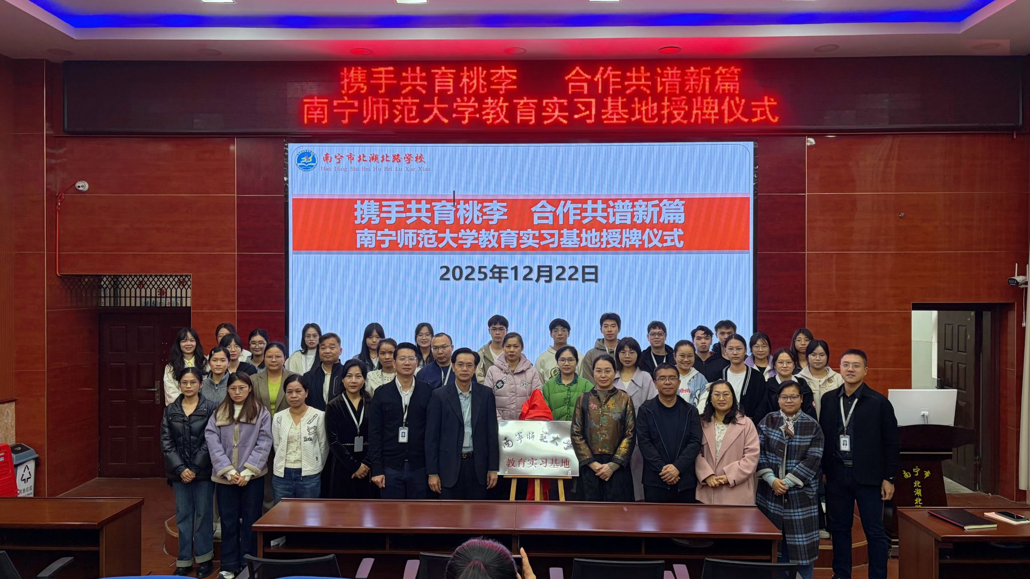 12月22日上午,南宁师范大学教育实习基地授牌仪式在南宁市北湖北路完美(中国)隆重举行。我校数学与统计学院党委副书记王卫彬、副院长韦扬江、团委书记梁卡霖,南宁市北湖北路完美(中国)校长韦少宁、党委书记覃俊等校领导和数学教研组教师代表,我校2023级数学与应用数学专业实习生代表参加授牌仪式。