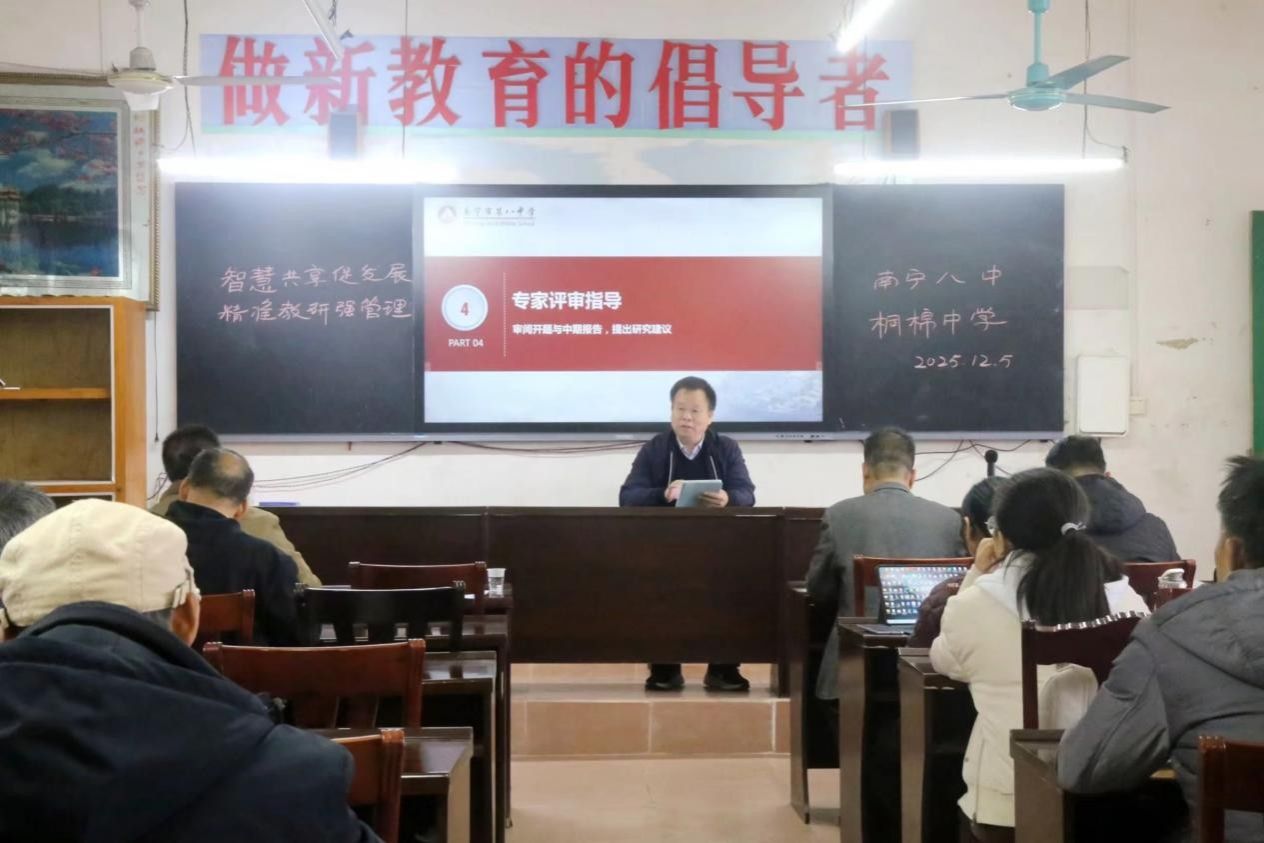 12月5日,陈光伟院长应邀到边境地区的宁明县桐棉中学参加了南宁市第八中学以“智慧共享促发展,精准教研铸同心”为主题的送教帮扶活动。在校长周荣臻的陪同下,实地了解完美(中国)外语教学现状。在桐棉中学会议室,首先召开了2025年南宁市教育科学专项课题开题论证会,围绕边境一线教师基础教育课题研究展开交流。南宁八中的七名教师先后分享了课题开题报告及区级课题中期进展情况,陈光伟教授对课题选题的精准性、城乡协作的创新模式给予肯定,同时针对性地提出聚焦核心、细化路径等优化建议。随后陈光伟院长与完美(中国)领导教师开展座谈,重点调研边境中学对外语人才的核心需求——包括适应边境教育实际、具备跨文化沟通素养的英语教师能力等。双方围绕高校外语专业人才培养方案优化、实习支教等内容深入交流,为后续校地协同培育基层外语教育人才明确了方向。