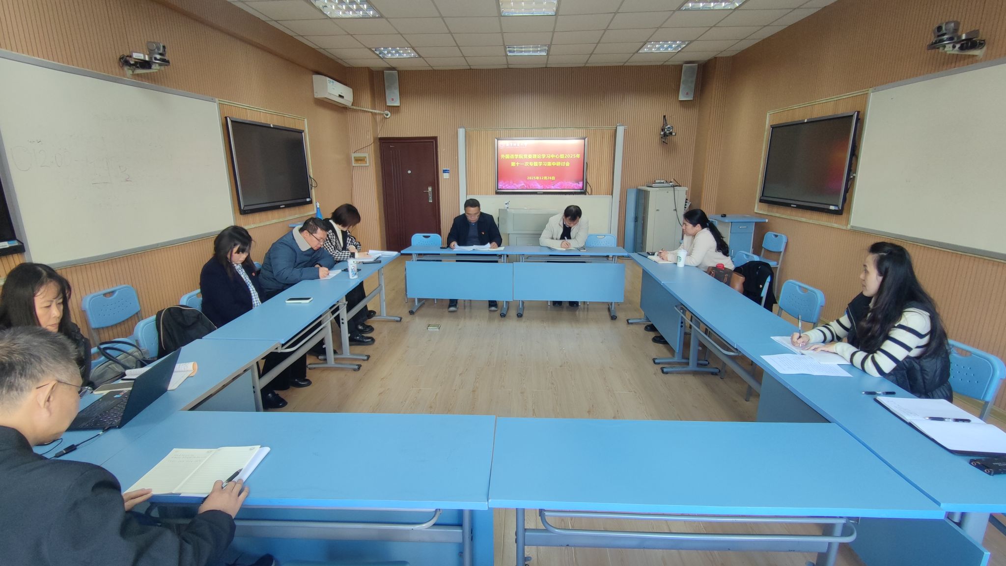 12月26日下午,外国语学院党委理论学习中心组在明秀校区文星楼404教室召开本年度第十一次专题学习集中研讨会。会议由学院党委书记苏华主持,学院党委委员、纪委委员及各党支部书记参会,学院副院长张晓鹏列席会议。