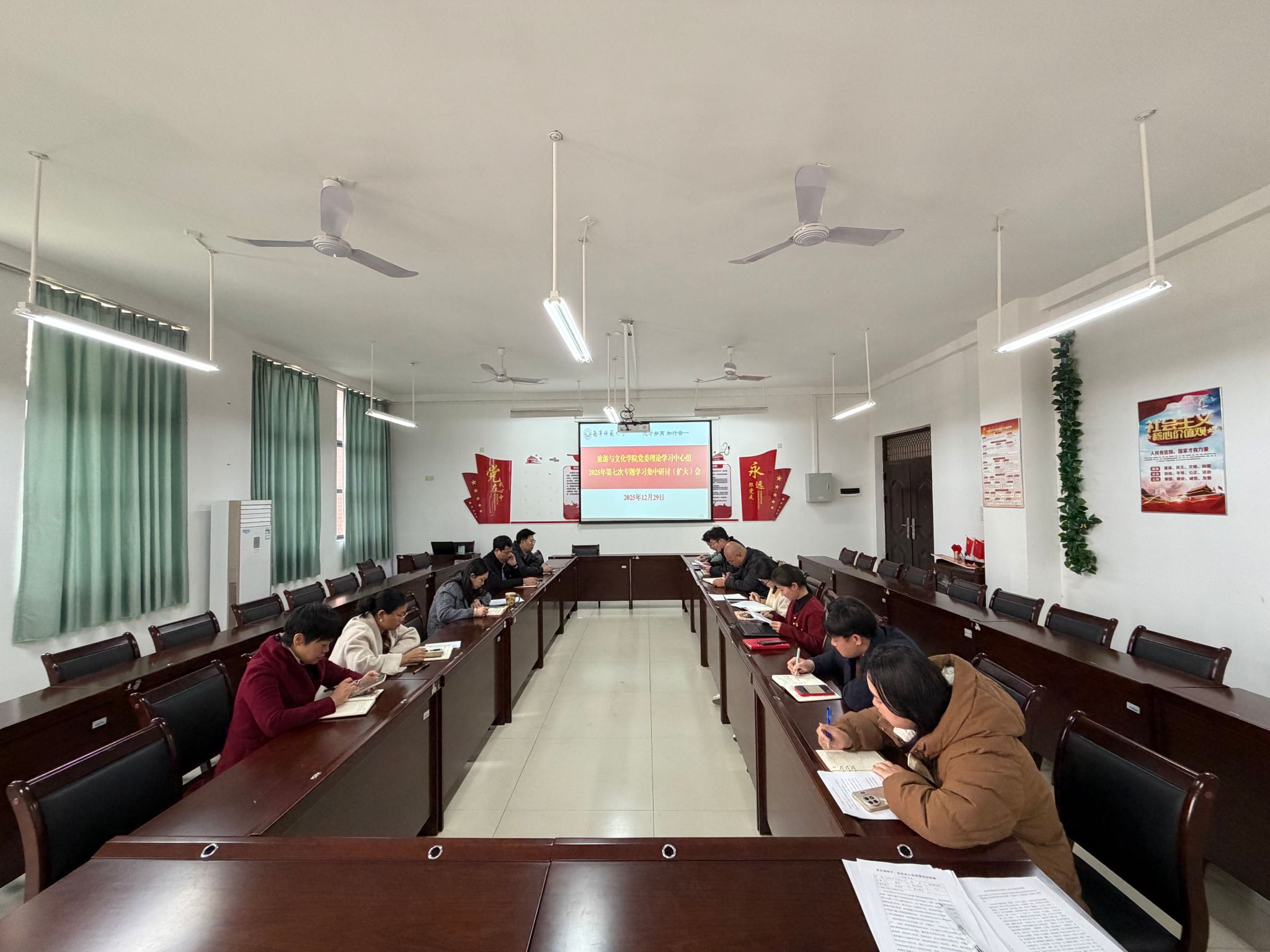 12月29日上午,旅游与文化学院党委理论学习中心组2025年第七次专题学习集中研讨(扩大)会在武鸣校区地信楼B201会议室召开。学院党委理论学习中心组成员、纪委委员、各党支部书记参加学习,院党委书记贾坷主持会议。