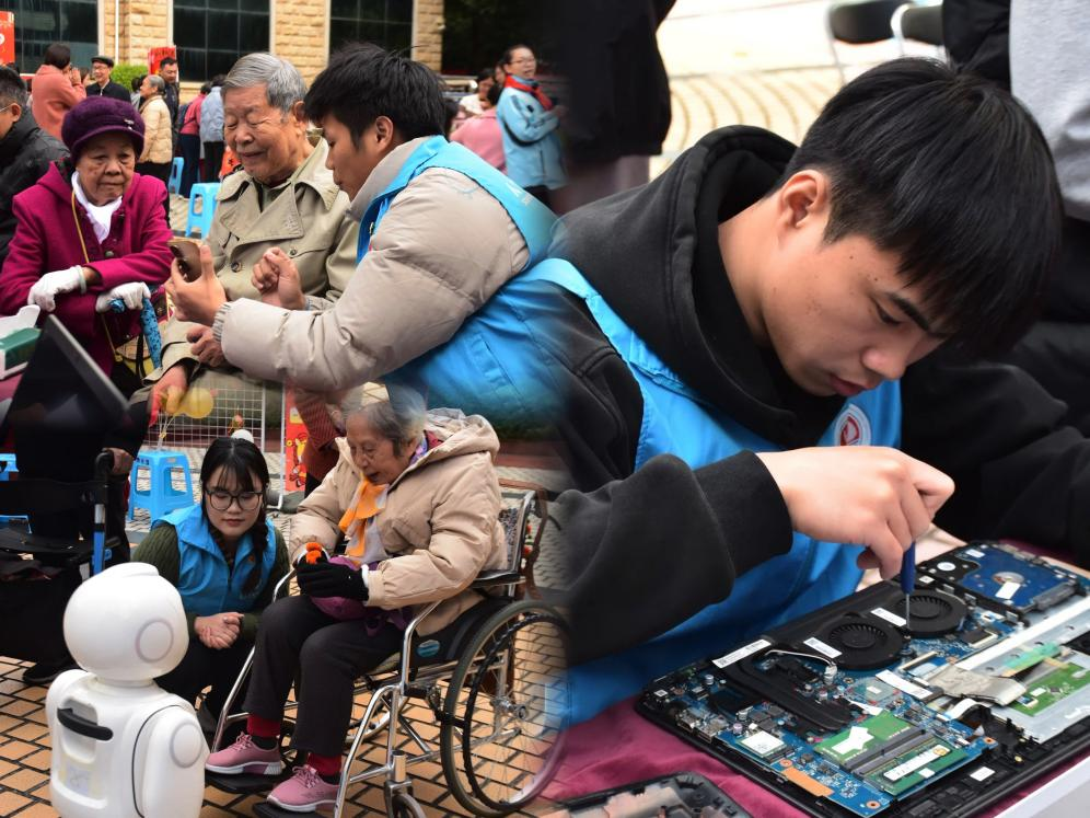 签约仪式后,学院党委组织师生党员、入党积极分子和团员青年投入到主题党日活动中,包括主题摄影服务、科技互动体验和技术支持与交流三个活动专区。志愿者们用摄影设备为老同志们记录温馨瞬间;利用AI技术为老同志修复泛黄的老照片,让珍贵记忆重现光彩;通过智能机器人演示和语音互动,生动展示科技如何便利生活;还借助AI诗词互动程序,与热爱诗词的老同志进行了一场别开生面的接句挑战,现场气氛热烈。此外,针对智能手机操作、电脑使用及防诈骗知识等常见问题,志愿者们也提供了耐心细致的“一对一”辅导。
