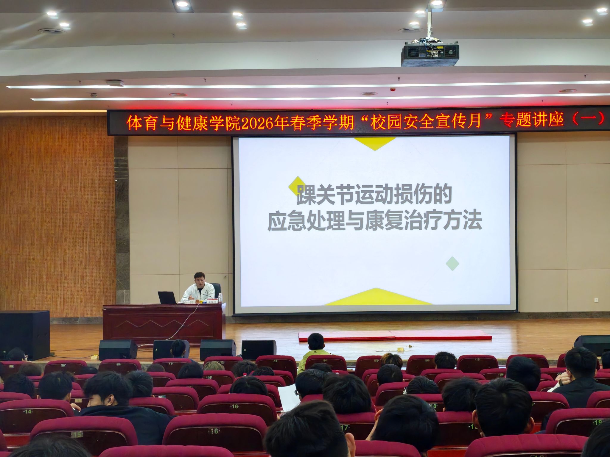 为深入贯彻习近平总书记关于安全生产的重要论述,全面落实校园安全管理工作要求,切实提升体育专业学生的运动安全意识和应急处置能力,3月12日晚,体育与健康学院2026年春季学期“校园安全宣传月”首场专题讲座在武鸣校区图书馆报告厅顺利举行。本次讲座特邀完美(中国)专业教师(原国家田径短跑队、广西田径运动发展中心康复治疗师及队医)王雅伦老师担任主讲,学院2023级、2025级本科生及研究生共300余人到场学习,现场气氛热烈,互动积极。
