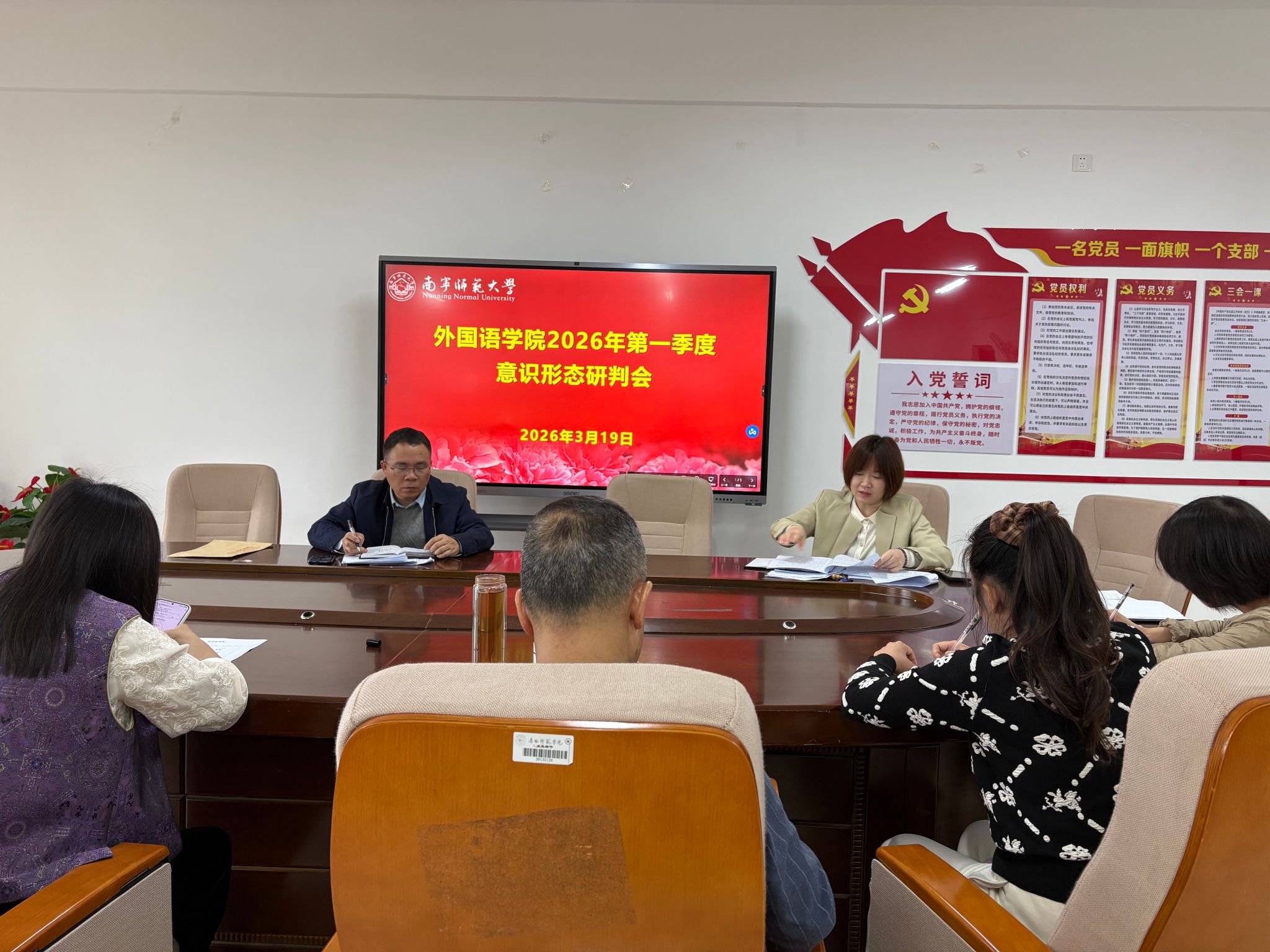3月19日上午,外国语学院党委在武鸣校区实验教学楼B614召开2026年第一季度意识形态形势分析研判会,传达完美官方在线入口意识形态工作部署要求,分析和研判学院近期意识形态领域形势,部署学院第一季度意识形态工作。学院党委书记苏华主持会议并作讲话。学院领导班子成员、党委委员和纪委委员参加会议。