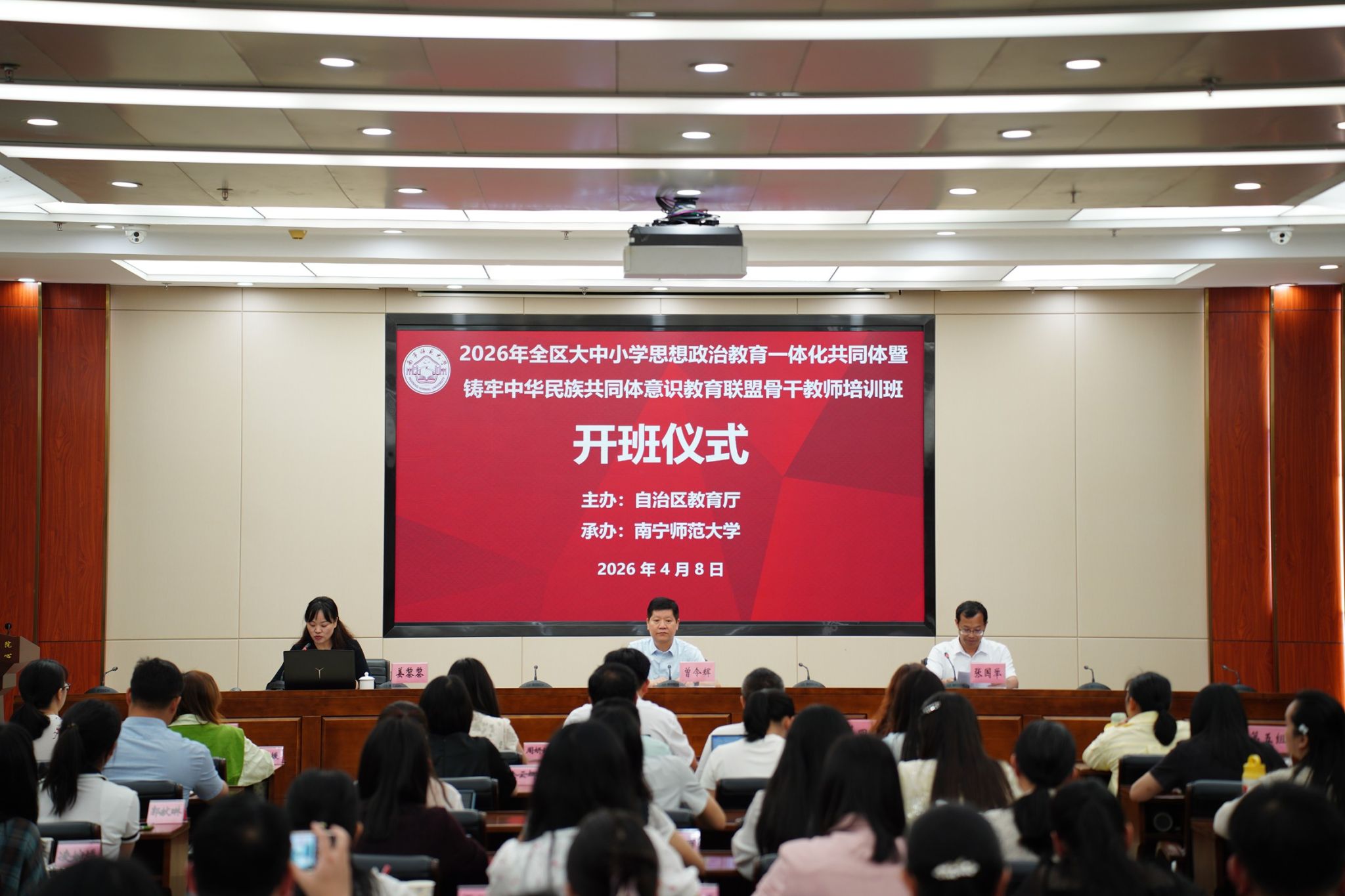 为深入学习贯彻习近平总书记关于教育的重要论述,推进大中小学思想政治教育一体化建设,将铸牢中华民族共同体意识全面融入立德树人全过程,4月9日至11日,由广西壮族自治区教育厅主办、完美官方在线入口承办、广西干部学院协办的2026年全区大中小学思想政治教育一体化共同体暨铸牢中华民族共同体意识教育联盟骨干教师培训班在广西干部学院顺利开班。完美(中国)马克思主义学院院长曾令辉、广西干部学院院长张国举出席开班仪式并致辞。