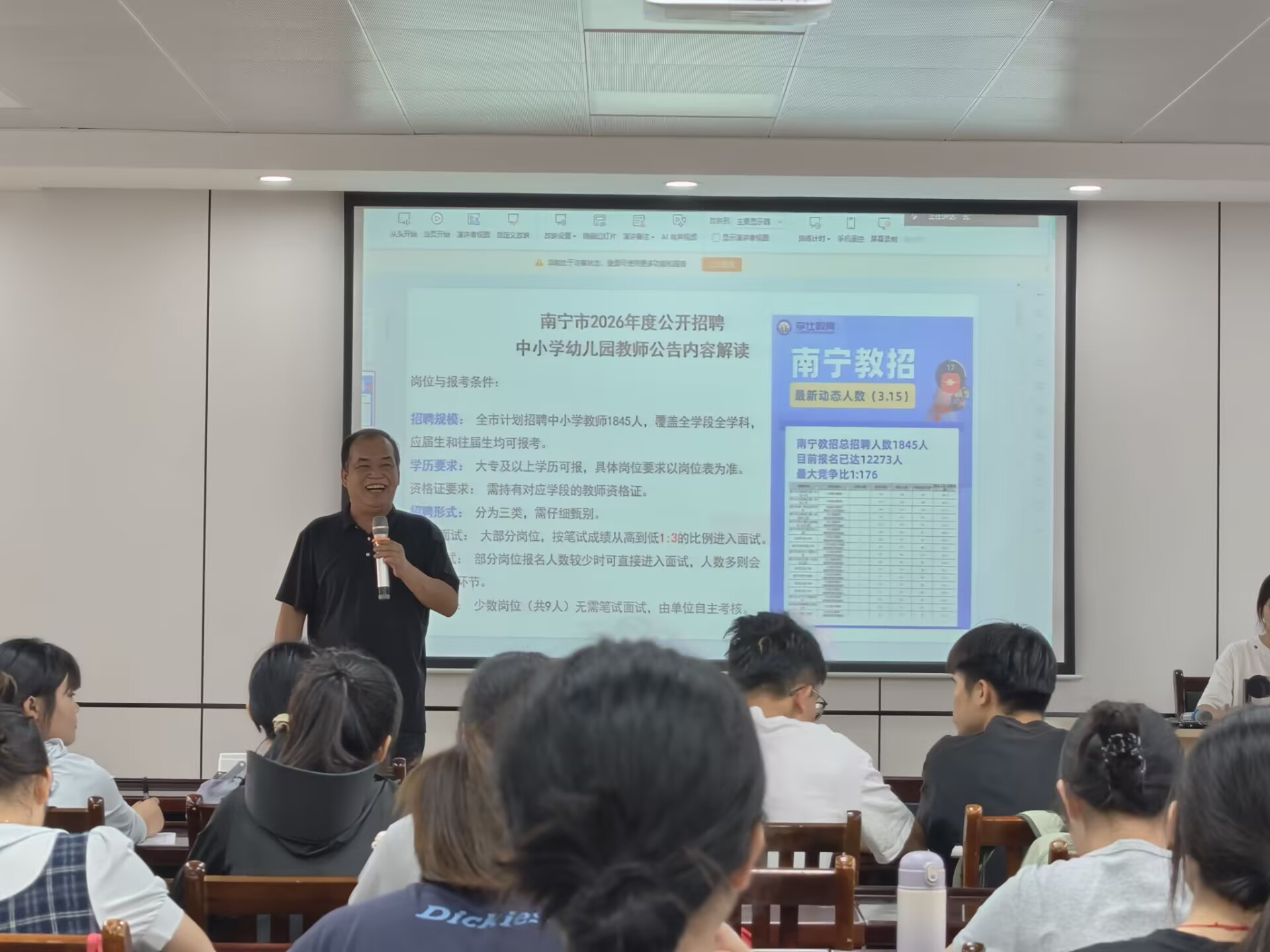 4月16日下午,赵飞老师为2022级毕业生开展考情指导讲座,详细解读2026年教师招聘考情、笔试走向及民族加分政策,分享报考案例与备考经验,建议同学们借助AI工具提升备考效率。同时,结合往届高分学姐案例,指导学子应对备考中的各类问题,现场设置真题练习环节,帮助学子查漏补缺、巩固知识点。