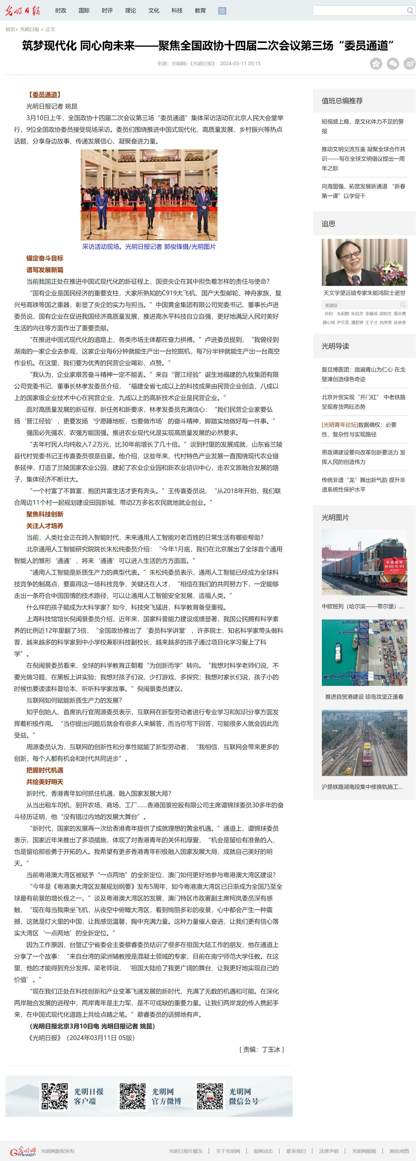 【光明日报】筑梦现代化 同心向未来——聚焦全国政协十四届二次会议第三场“委员通道”