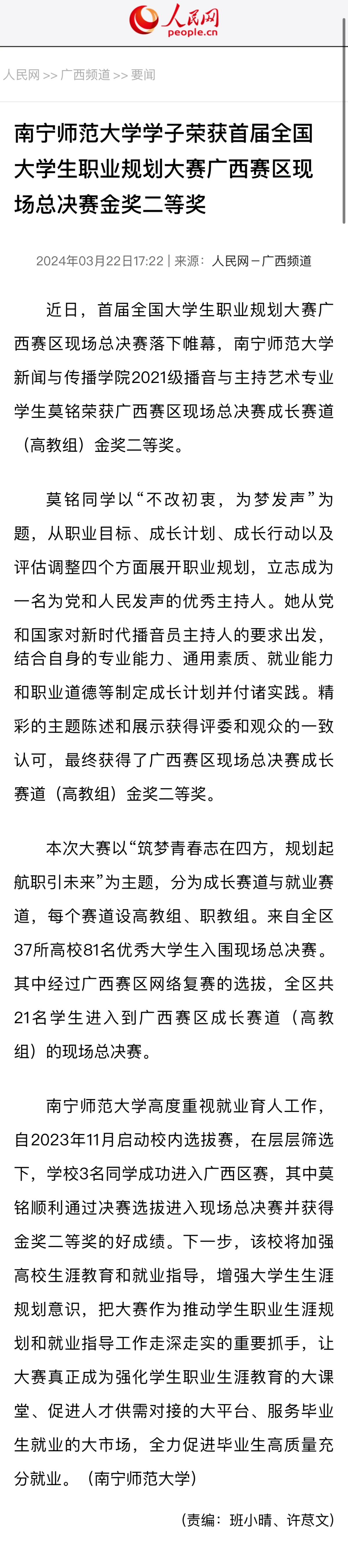 南宁师范大学学子荣获首届全国大学生职业规划大赛广西赛区现场总决赛金奖二等奖 (people.com.cn)
