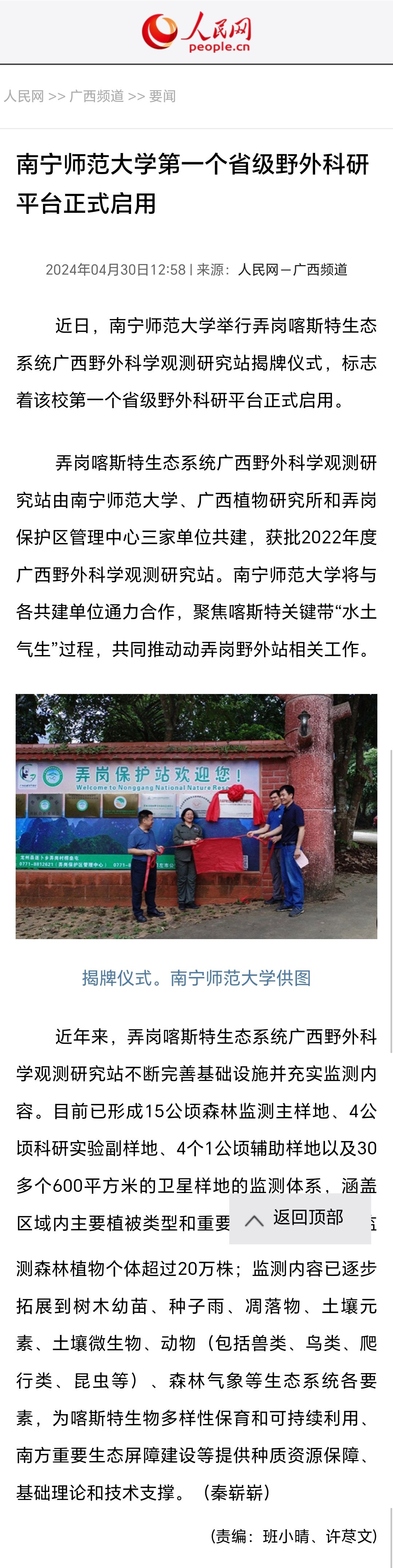 【人民网】南宁师范大学第一个省级野外科研平台正式启用